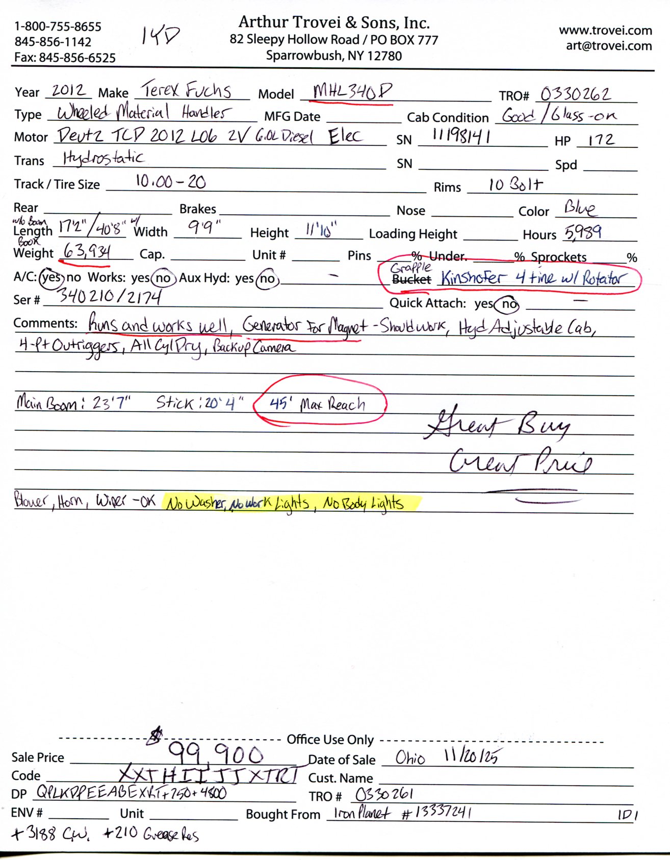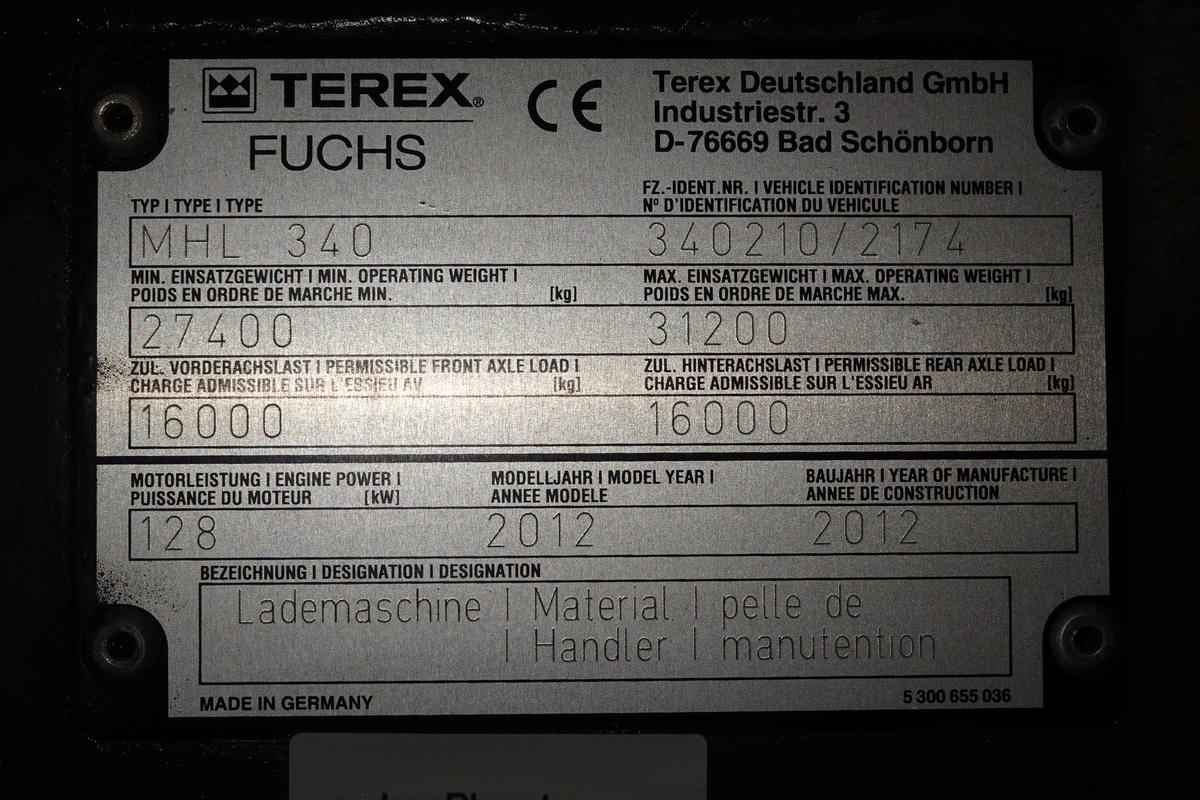 Inventory # 0330262Year: 2012 Make: Terex Fuchs Model: MHL340D Serial # 340210/2174 Type: Wheeled Material Handler Motor: Deutz TCD 2012 L06 2V 6.0L Diesel Elec 172 HP Air To Air: Yes Air Conditioning: Yes (Not Working) Transmission: Hydrostatic Tires: 10.00-20 Rims: 10 Bolt Hour Reading: 5,989 (3/30/26) Length w/o boom: 17'2" Shipping Length: 40'8" Width: 9'9" Height: 11'10" Book Weight: 63,934 lb Boom Details: 45' Reach - Main Boom: 23'7" - Stick: 20'4" Added Details: Runs And Works Well, All Cylinders Dry, 4 Tooth Kinshofer Grapple w/ Rotator, Generator For Magnet, Four Hydraulic Outriggers, Hydraulic Adjustable Cab Height, Backup Camera, Spec Sheet, Machine Card Price: $99,900 1YDXXTHIIJJXTRTQPLKDPEEABEXRT+750+4800+3188+210 Print This Page | Back to Recycling Equipment Inventory | Ask A Question Terms of Sale