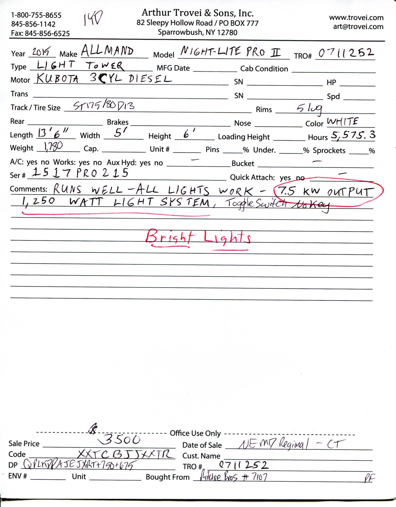 Inventory # 0711252Year: 2015 Make: Allmand Model: Night-Light Pro II Type: Light Tower Serial # 1517PRO215 Motor: Kubota 3 Cylinder Diesel Tires: ST175/80D13 Rims: 5 Lug - Steel Hours: 5,575 Length: 13'6" Width: 5' Height: 6' Weight: 1,780 lb Added Details: Runs Well, 7.5kW Generator, 120V Receptical, 4x Lights, 1,250W Light System, Pintle Hook, Trailer Ball Price: $3,500 1YDXXTCBJJXXTRQPLKDPAJEJXRT+750+675 Print This Page | Back to Miscellaneous Inventory | Ask A Question Terms of Sale