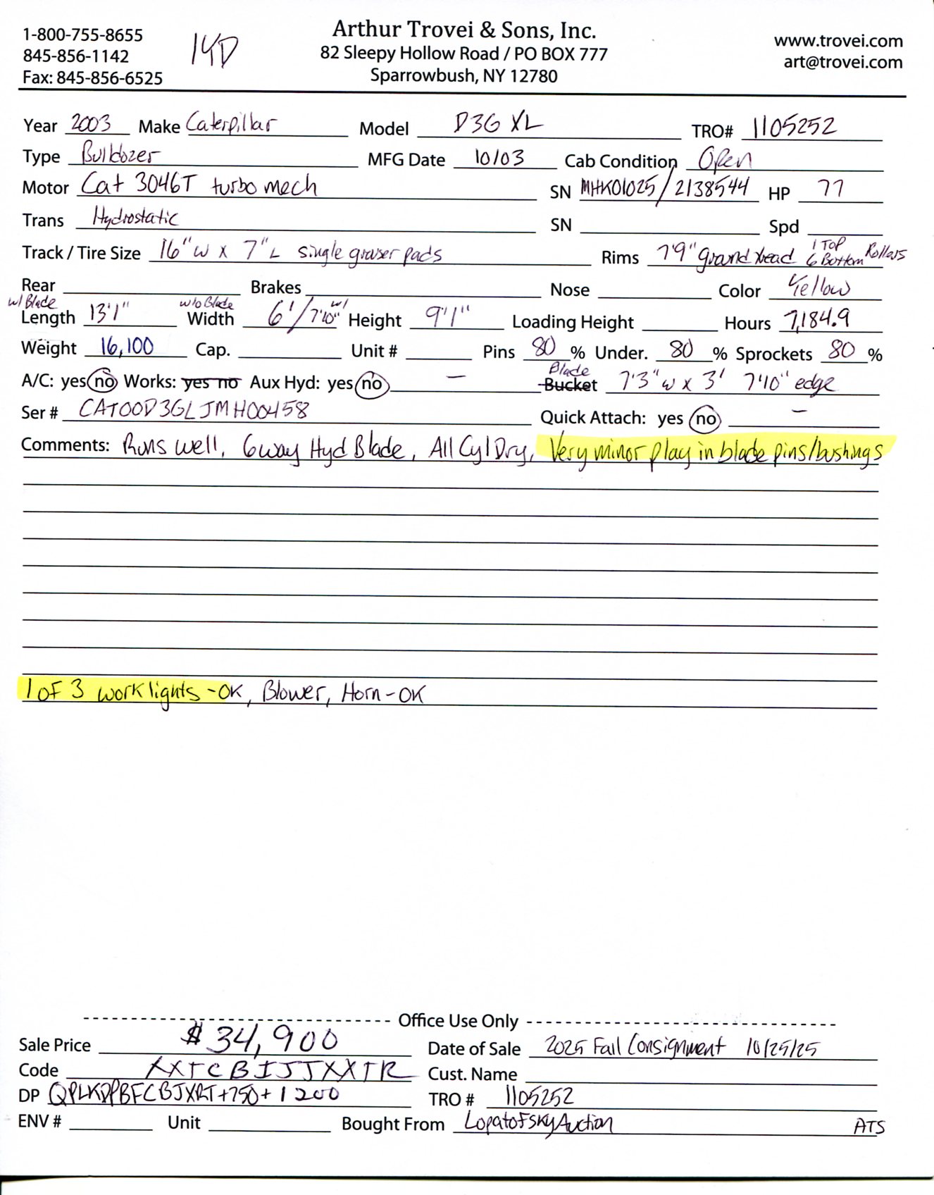 Inventory # 1105252Year: 2003 Make: Caterpillar Model: D3G XL Type: Bulldozer Serial # CAT00D3GLJMH00458 Motor: Caterpillar 3046T Turbo Diesel Mech 77 HP Transmission: Hydrostatic Rear: Tracks: 16" W x 7" L, Single Grouser Pads - 7'9" Ground Tread - 6 Bottom Rollers, 1 Top Roller Hour Meter Reading: 7,184 Length w/ Blade: 13'1" Width: 6' Width w/ Blade: 7'10" Height: 9'1" Undercarriage: 80% Weight: 16,100 lb Blade Details: 7'3" W x 3' T - 7'10" Steel Edge - 6 Way Hydraulic Blade Added Details: Runs And Works Well, All Cylinders Dry, Very Minor Play In Blade Pins And Bushings, Open ROPS Price: $34,900 1YDXXTCBIJJXXTRQPLKDPBFCBJXRT+750+1200 Print This Page | Back to Bulldozer Inventory | Ask A Question Terms of Sale
