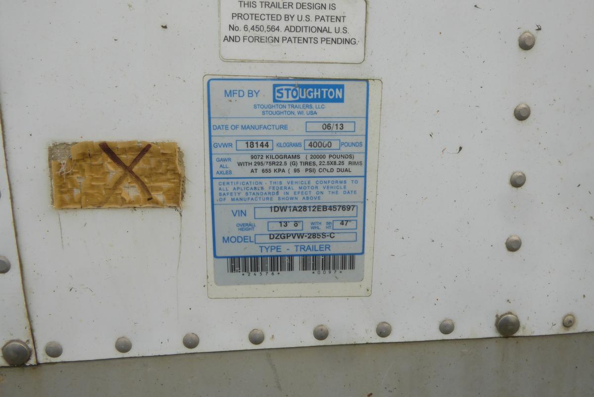Inventory # 0518247Year: 2014 Make: Stoughton Model: DZGPVW-285S-C Axles: Fixed Single Type: Dry Box Trailer VIN: 1DW1A2812EB457697 Suspension: 2 Spring Tires: 295/75R22.5 Rims: 10 Bolt Hub Pilot - Steel Length: 28' Width: 102" Height: 13'6" Weight (Approximate): 8,540 lb GVW: 40,000 lb Floor Composition: Wood / Steel Trailer Composition: Steel / Aluminum Door Type: Roll Up - Steel Surround (Not Working) Door Opening Width: 7'8" Door Opening Height: 8'8" Added Details: Air Brakes, Can Pull Doubles, Aluminum Roof, Side Windows, Side Skirts Price: $2,200 209DCXXTAFJJXXTQPLKDPGFEXRT+750+300 Terms of Sale