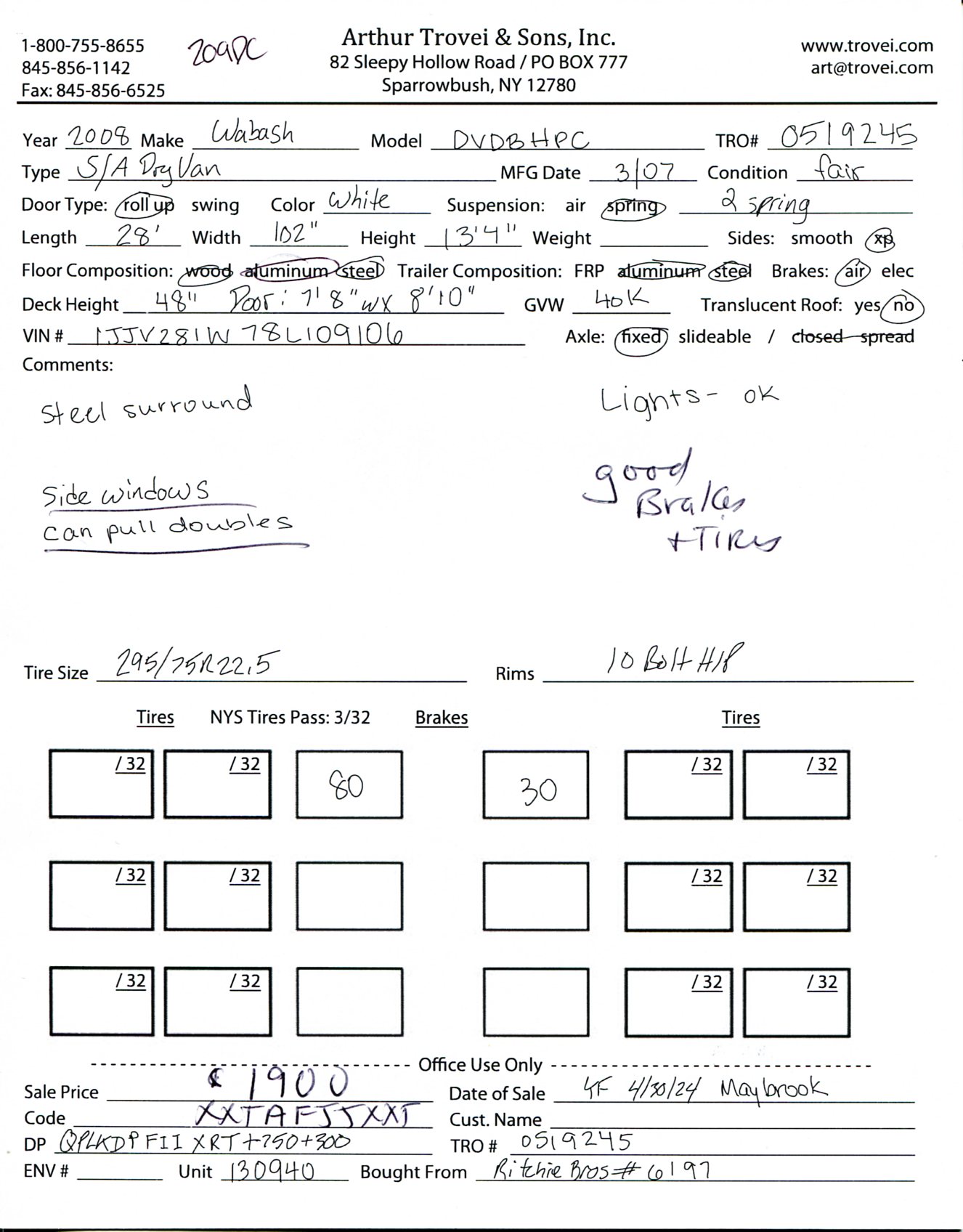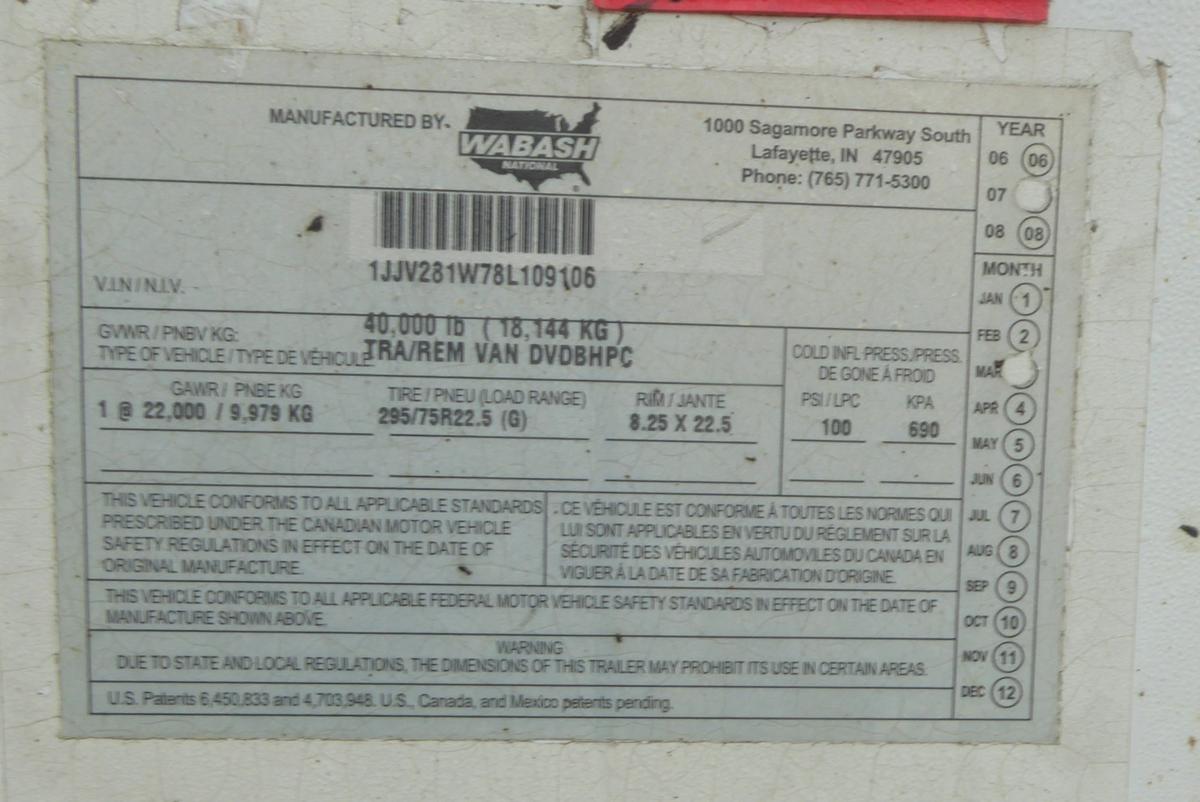 Inventory # 0519245Year: 2008 Make: Wabash Model: DVDBHPC Axles: Fixed single Type: Dry box trailer VIN: 1JJV281W78L109106 Suspension: 2 Spring Tires: 275/80R22.5 / 295/75R22.5 Rims: 10 Bolt Hub Pilot - Steel Length: 28' Width: 102" Height: 13'4" Weight (Estimated): 8,760 lb GVW: 40,000 lb Floor Composition: Wood / Steel / Aluminum Trailer Composition: Steel / Aluminum Door Type: Roll Up - Steel Surround Door Opening Width: 7'8" Door Opening Height: 8'10" Added Details: Air Brakes, Side Windows, Can Pull Doubles, Aluminum Roof, Vertical Logistics, Some Aluminum Crossmembers Price: $1,900 209DCXXTAFJJXXTQRTVDPFIIXRT+750+300 Terms of Sale