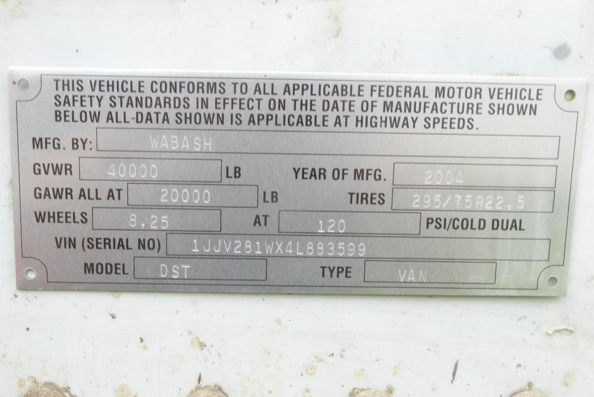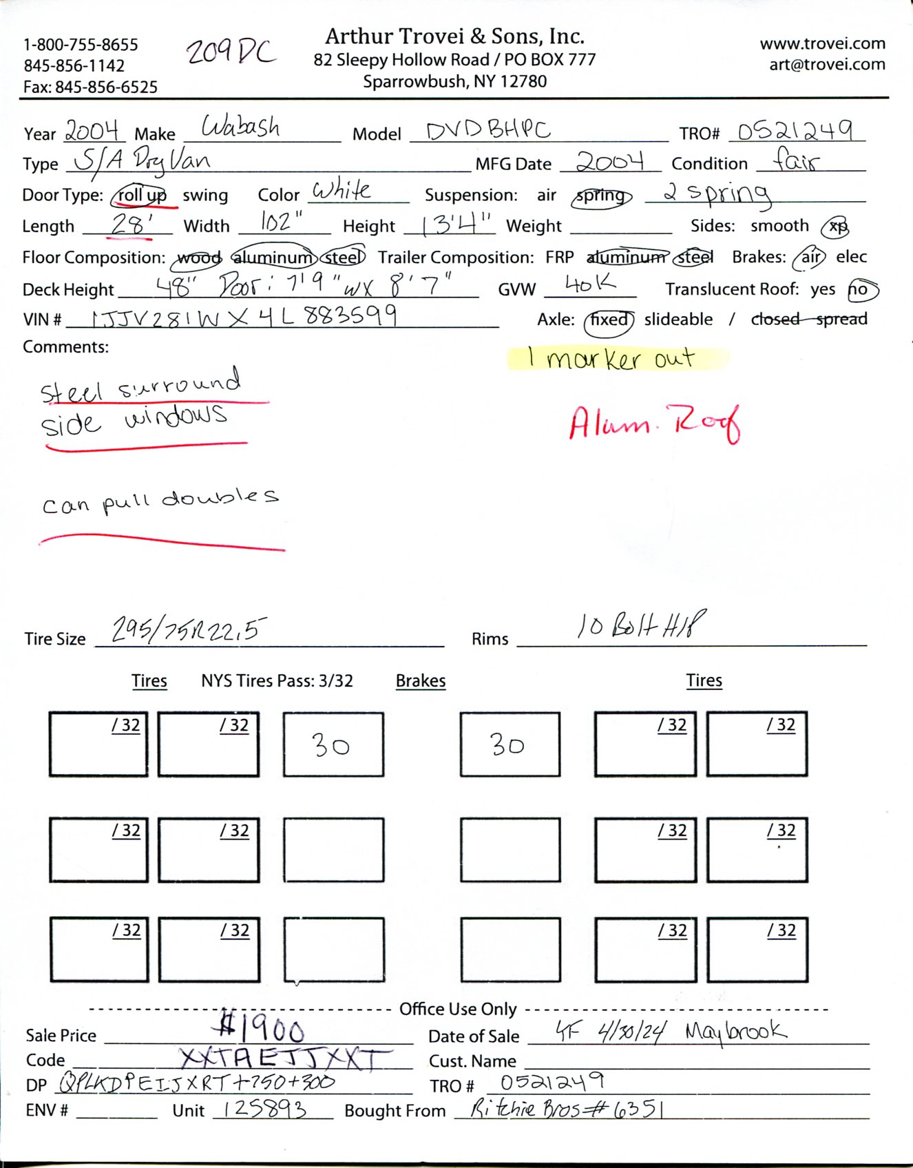 Inventory # 0521249Year: 2004 Make: Wabash Model: DVDBHPC Axles: Fixed Single Type: Dry Box Trailer VIN: 1JJV281WX4L883599 Suspension: 2 Spring Tires: 275/80R22.5 / 295/75R22.5 Rims: 10 Bolt Hub Pilot - Steel Length: 28' Width: 102" Height: 13'4" Weight (Estimated): 8,920 lb GVW: 40,000 lb Floor Composition: Wood / Steel / Aluminum Trailer Composition: Aluminum / Steel Door Type: Roll Up - Steel Surround Door Opening Width: 7'9" Door Opening Height: 8'7" Added Details: Air Brakes, Can Pull Doubles, Aluminum Roof, Side Windows, Vertical Logistics, Some Aluminum Crossmembers Price: $1,900 209DCXXTAEJJXXTQRTVDPEIJXRT+750+300 Terms of Sale