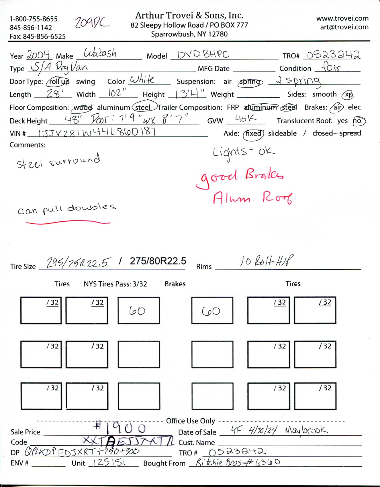 Inventory # 0523242Year: 2004 Make: Wabash Model: DVDBHPC Axles: Fixed Single Type: Dry Box Trailer VIN: 1JJV281W44L860187 Suspension: 2 Spring Tires: 275/80R22.5 / 295/75R22.5 Rims: 10 Bolt Hub Pilot - Steel Length: 28' Width: 102" Height: 13'4" Weight (Estimated): 8,920 lb GVW: 40,000 lb Floor Composition: Wood / Steel Trailer Composition: Aluminum / Steel Door Type: Roll Up - Steel Surround Door Opening Width: 7'9" Door Opening Height: 8'7" Added Details: Air Brakes, Can Pull Doubles, Aluminum Roof, Vertical Logistics, Some Aluminum Crossmembers Price: $1,900 209DCXXTAEJJXXTQRTVDPEDJXRT+750+300 Terms of Sale