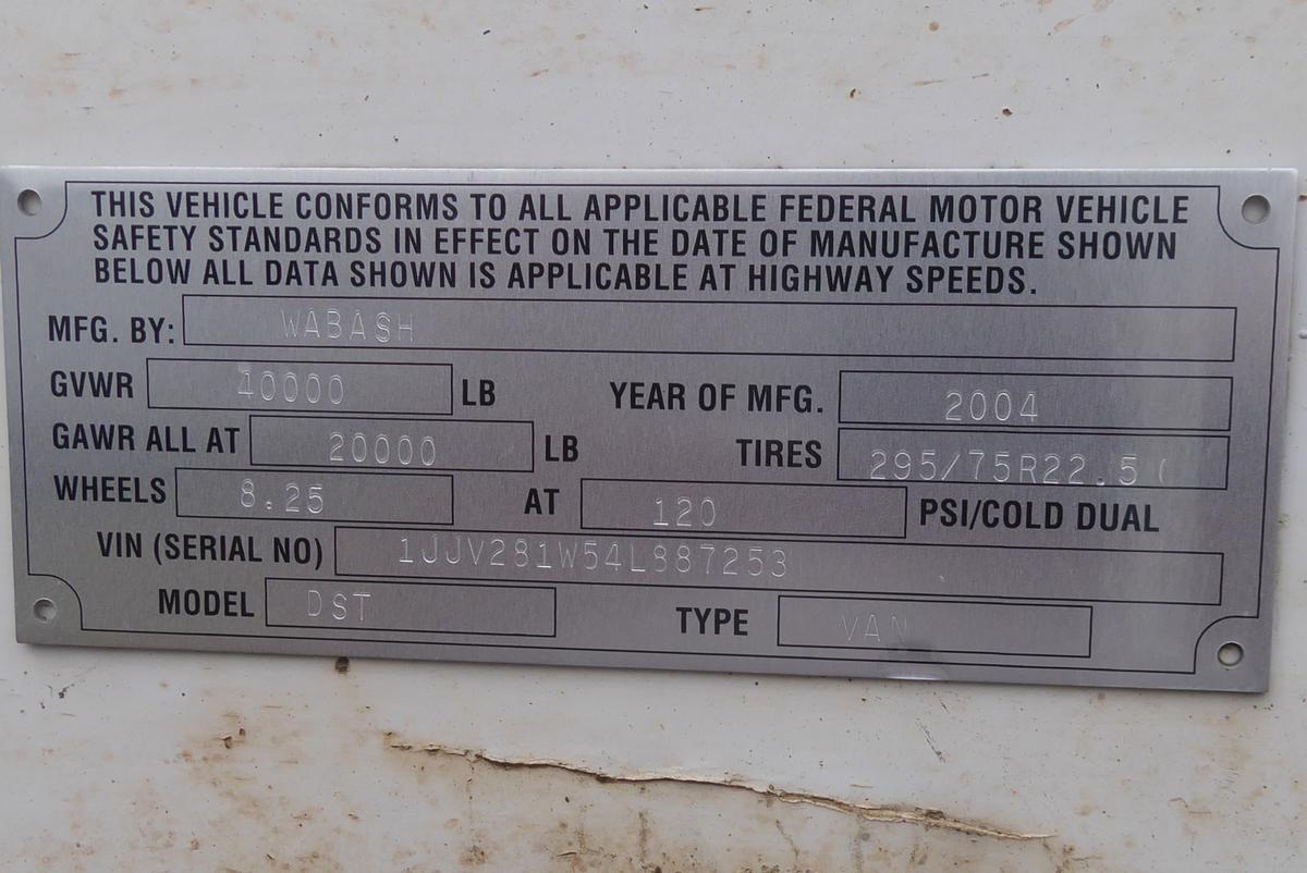 Inventory # 0523247Year: 2004 Make: Wabash Model: DVDBHPC Axles: Fixed Single Type: Dry Box Trailer VIN: 1JJV281W54L887253 Suspension: 2 Spring Tires: 275/80R22.5 / 295/75R22.5 Rims: 10 Bolt Hub Pilot - Steel Length: 28' Width: 102" Height: 13'4" Weight (Estimated): 8,920 lb GVW: 40,000 lb Floor Composition: Wood / Steel / Aluminum Trailer Composition: Aluminum / Steel Door Type: Roll Up - Steel Surround Door Opening Width: 7'9" Door Opening Height: 8'7" Added Details: Air Brakes, Can Pull Doubles, Aluminum Roof, Vertical Logistics, Some Aluminum Crossmembers Price: $1,900 209DCXXTAFJJXXTQRTVDPEJIXRT+750+300 Terms of Sale