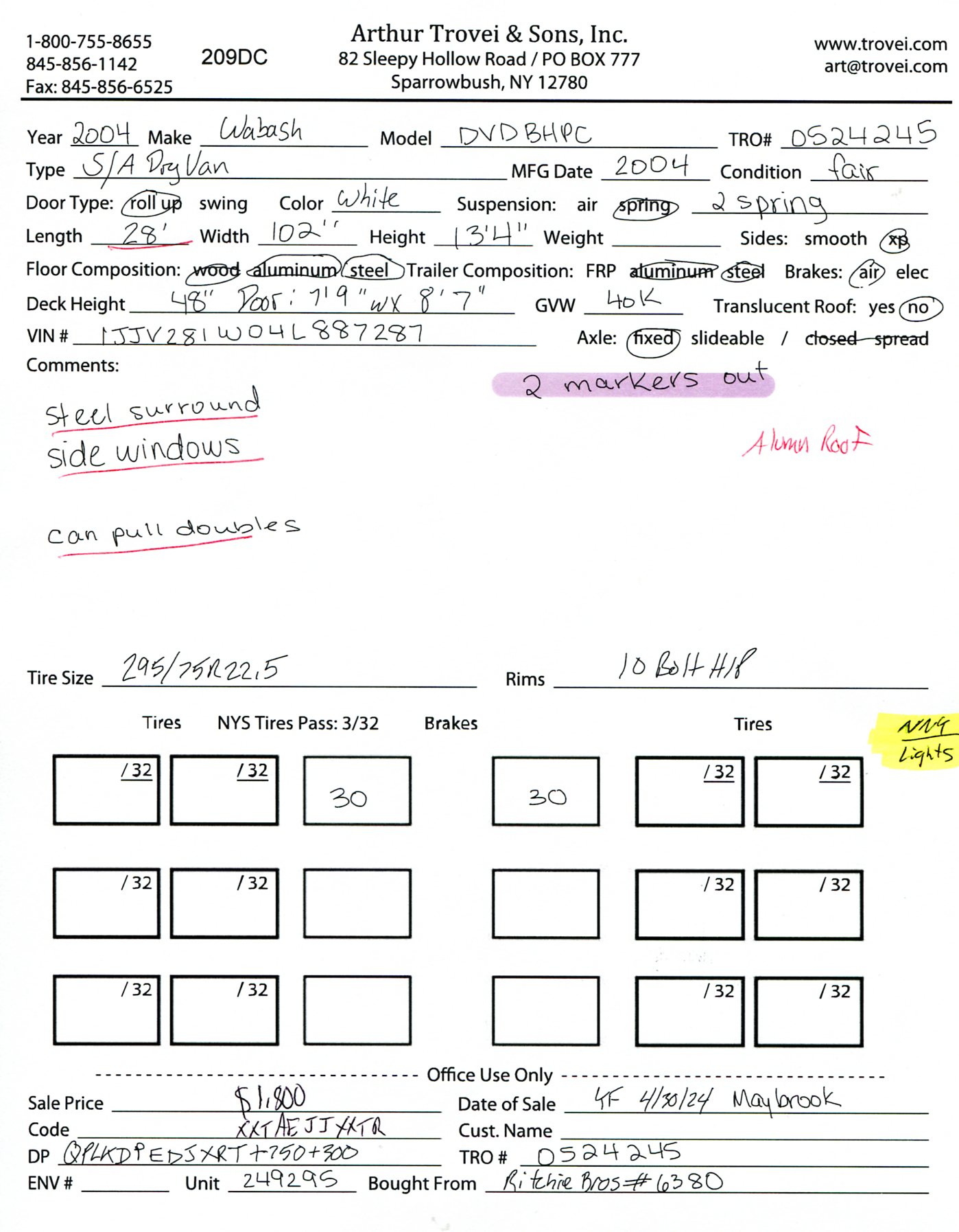 Inventory # 0524245Year: 2004 Make: Wabash Model: DVDBHPC Axles: Fixed Single Type: Dry Box Trailer VIN: 1JJV281W04L887287 Suspension: 2 Spring Tires: 295/75R22.5 Rims: 10 Bolt Hub Pilot - Steel Length: 28' Width: 102" Height: 13'4" Weight (Estimated): 8,920 lb GVW: 40,000 lb Floor Composition: Wood / Steel / Aluminum Trailer Composition: Aluminum / Steel Door Type: Roll Up - Steel Surround Door Opening Width: 7'9" Door Opening Height: 8'7" Added Details: Air Brakes, Can Pull Doubles, Side Windows, Aluminum Roof, Vertical Logistics, Some Aluminum Crossmembers Price: $1,800 NNY 209DCXXTAEJJXXTQRTVDPEDJXRT+750+300 Terms of Sale