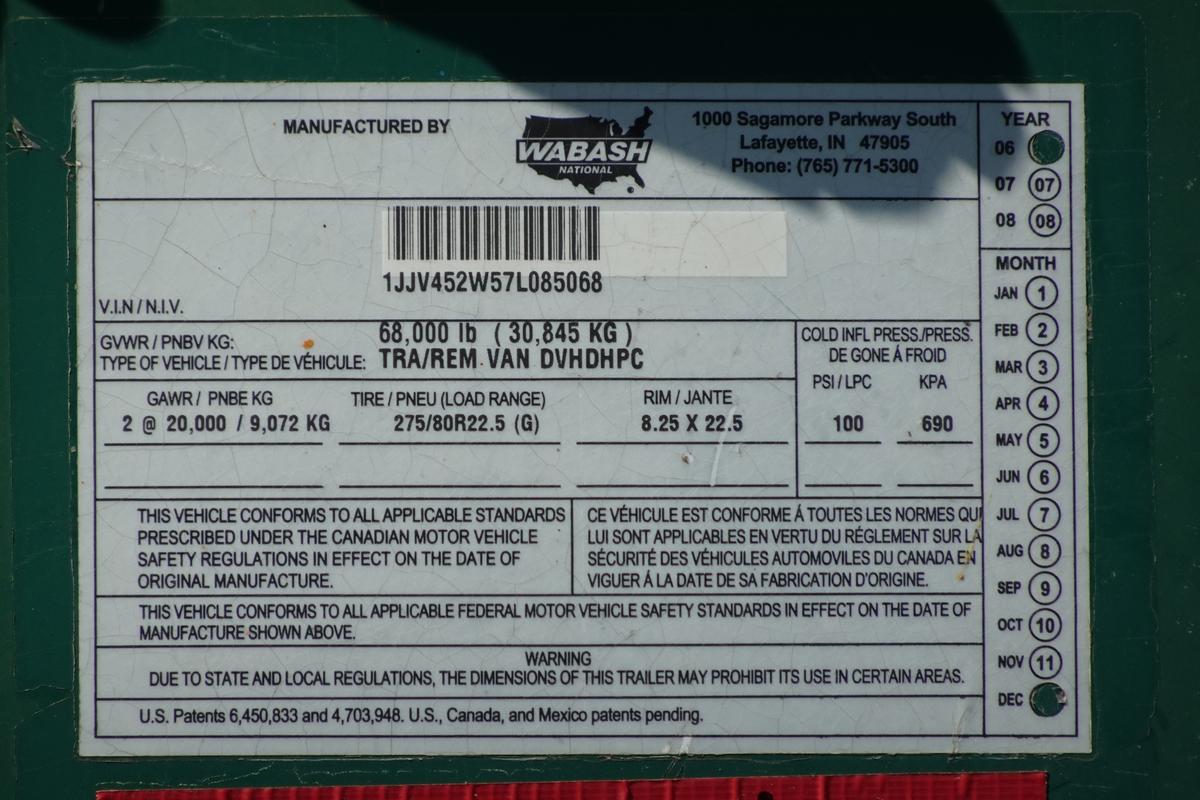 Inventory # 0526241Year: 2007 Make: Wabash Model: DVHDHPC Axles: Slideable Closed Tandem Type: Dry Box Trailer VIN: 1JJV452W57L085068 Suspension: 4 Spring Tires: 275/80R22.5 / 295/75R22.5 Rims: 10 Bolt Hub Pilot - All Steel Length: 45' Width: 8' Height: 12'4" Weight (Estimated): 13,260 lb Load Width: 7'3" Load Height: 7'11" GVWR: 68,000 lb Trailer Composition: Aluminum / Steel Floor Composition: Wood / Steel Door Type: Roll Up Door - Steel Surround Added Details: Air Brakes, Aluminum Roof Price: $3,900 as described 209DCXXTCEJJXXTRQPLKDPIBJXRT+750+300 Terms of Sale