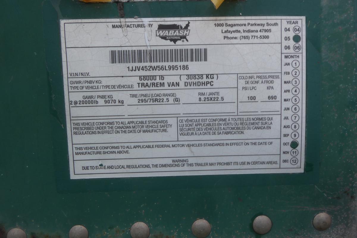 Inventory # 0527243Year: 2006 Make: Wabash Model: DVHDHPC Axles: Slideable Closed Tandem Type: Dry Box Trailer VIN: 1JJV452W56L995186 Suspension: 4 Spring Tires: 275/80R22.5 / 295/75R22.5 Rims: 10 Bolt Hub Pilot - All Steel Length: 45' Width: 8' Height: 12'4" Weight (Estimated): 13,260 lb Load Width: 7'3" Load Height: 7'9" GVWR: 68,000 lb Trailer Composition: Aluminum / Steel Floor Composition: Wood / Steel Door Type: Roll Up Door - Steel Surround Added Details: Air Brakes, Translucent Roof Price: $2,900 as described 209DCXXTBEJJXXTRQPLKDPGFEXRT+750+300 Terms of Sale