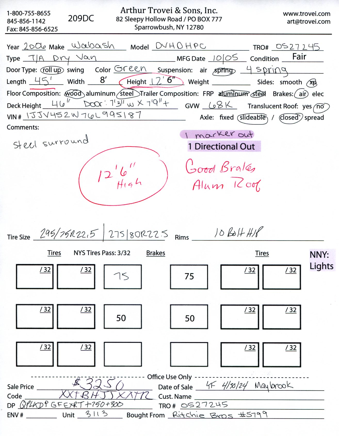Inventory # 0527245Year: 2006 Make: Wabash Model: DVHDHPC Axles: Slideable Closed Tandem Type: Dry Box Trailer VIN: 1JJV452W76L995187 Suspension: 4 Spring Tires: 275/80R22.5 / 295/75R22.5 Rims: 10 Bolt Hub Pilot - All Steel Length: 45' Width: 8' Height: 12'6" Weight (Estimated): 13,260 lb Load Width: 7'3" Load Height: 7'9" GVWR: 68,000 lb Trailer Composition: Aluminum / Steel Floor Composition: Wood / Steel Door Type: Roll Up Door - Steel Surround Added Details: Air Brakes, Aluminum Roof Price: $3,250 NNY 209DCXXTBHJJXXTRQPLKDPGFEXRT+750+300 Terms of Sale