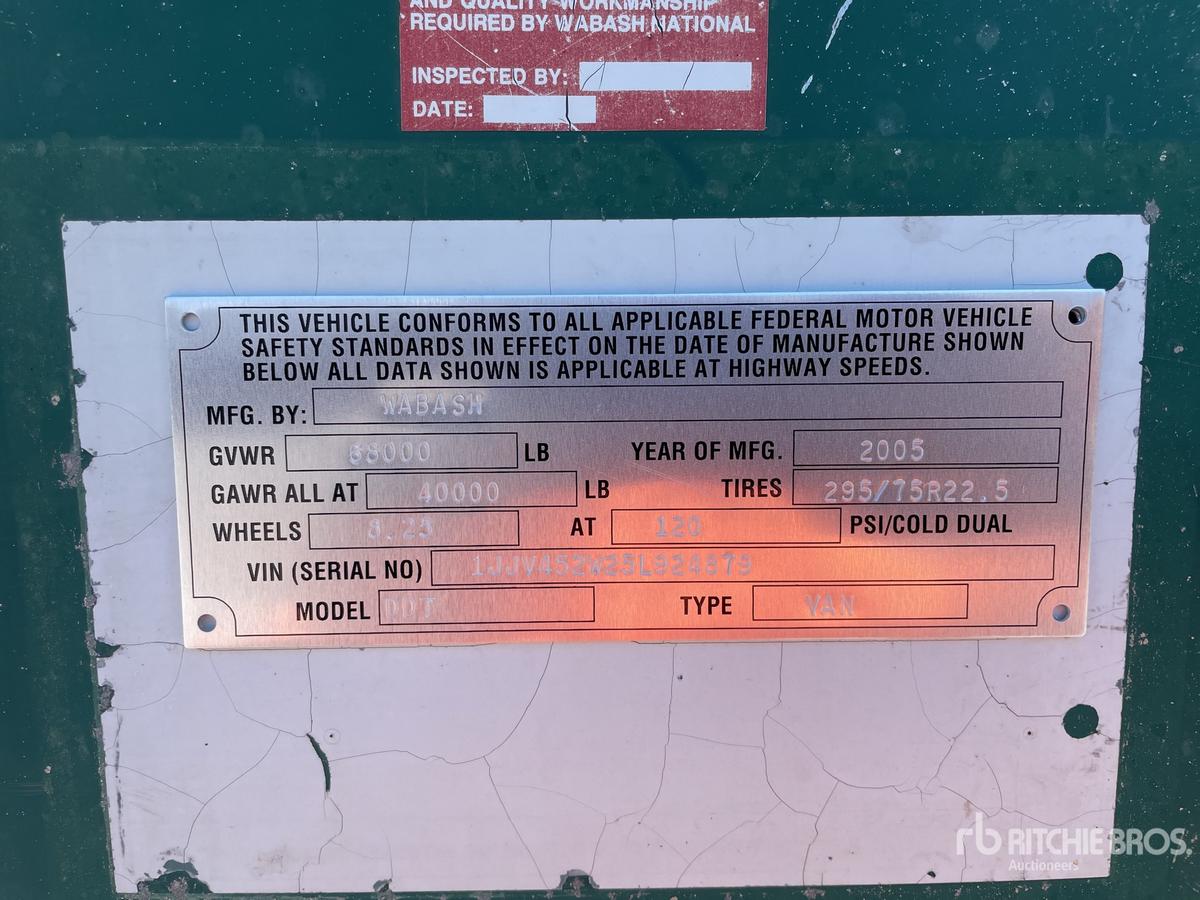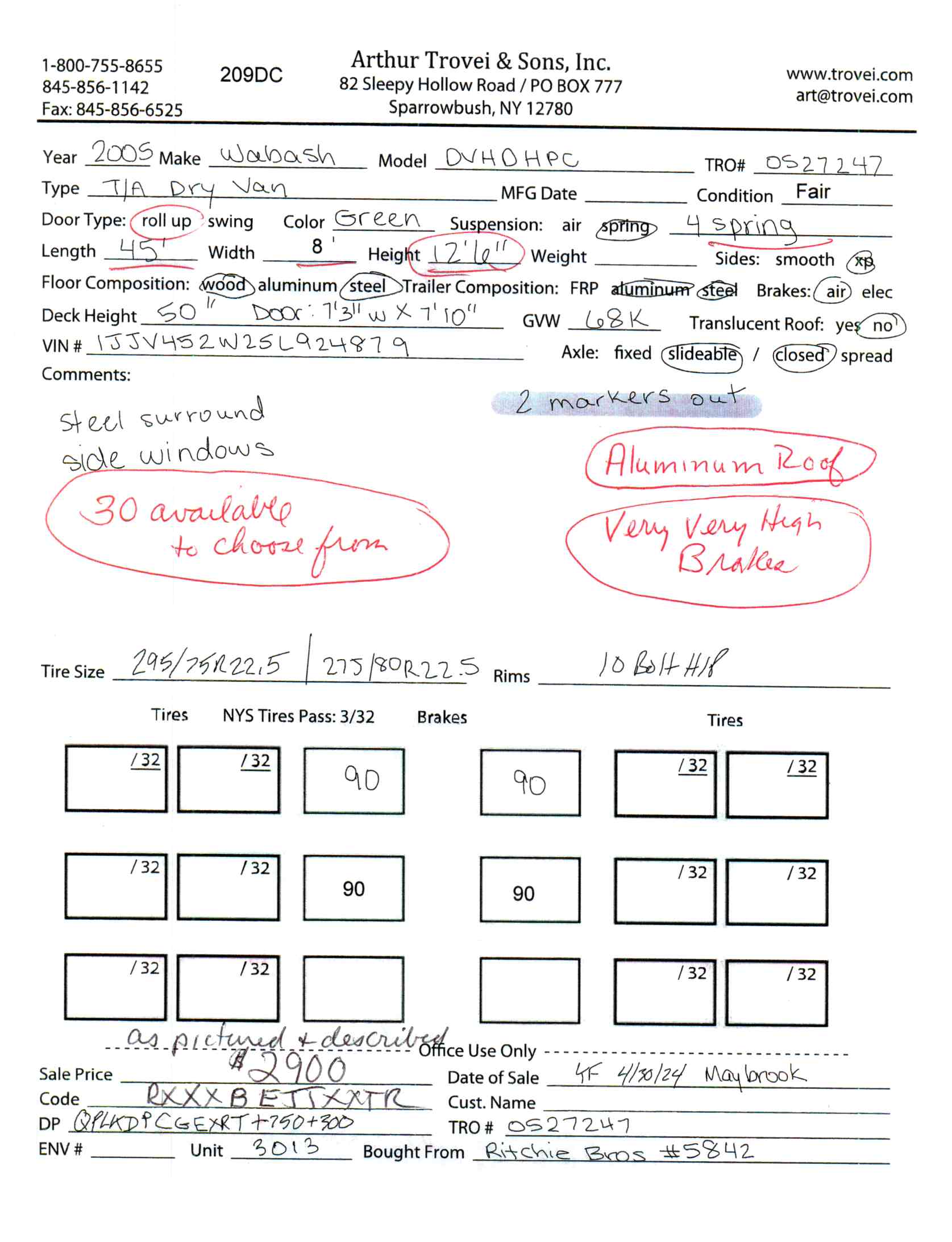 Inventory # 0527247Year: 2005 Make: Wabash Model: DVHDHPC Axles: Slideable Closed Tandem Type: Dry Box Trailer VIN: 1JJV452W25L924879 Suspension: 4 Spring Tires: 275/80R22.5 / 295/75R22.5 Rims: 10 Bolt Hub Pilot - All Steel Length: 45' Width: 8' Height: 12'6" Weight (Estimated): 13,260 lb Load Width: 7'3" Load Height: 7'10" GVWR: 68,000 lb Trailer Composition: Aluminum / Steel Floor Composition: Wood / Steel Door Type: Roll Up Door - Steel Surround Added Details: Air Brakes, Aluminum Roof, Side Windows Price: $2,900 as described NNY 209DCXXTBEJJXXTRQPLKDPCGEXRT+750+300 Terms of Sale