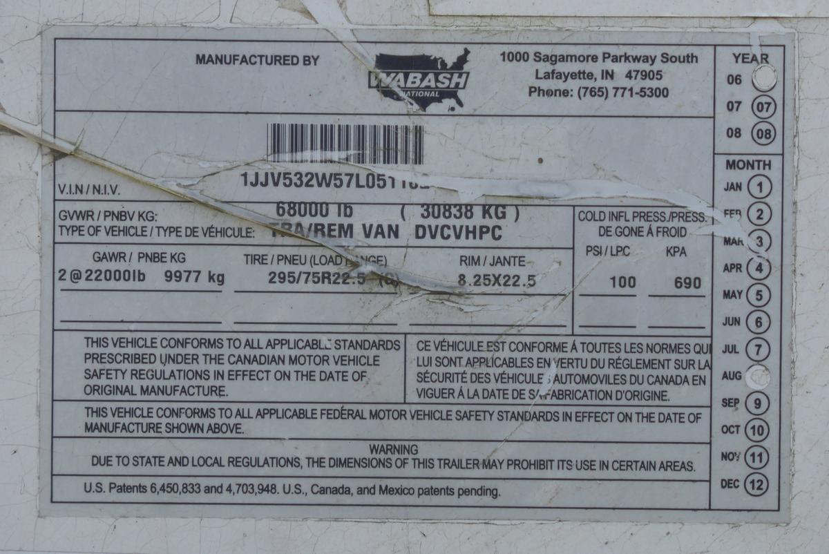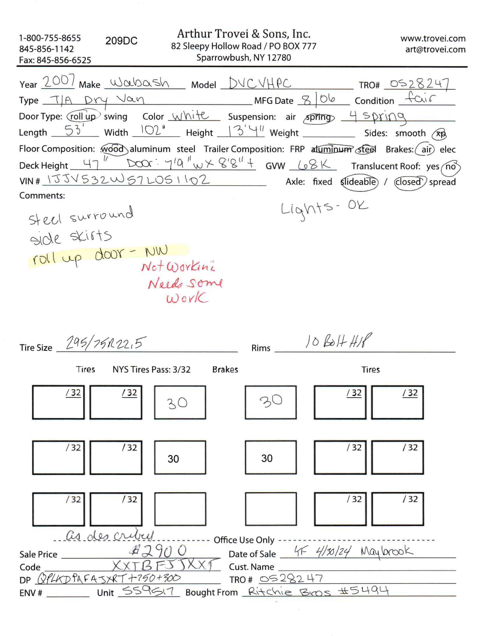 Inventory # 0528247Year: 2007 Make: Wabash Model: DVCVHPC Axles: Slideable Closed Tandem Type: Dry Box Trailer VIN: 1JJV532W57L051102 Suspension: 4 Spring Tires: 275/80R22.5 / 295/75R22.5 Rims: 10 Bolt Hub Pilot - Steel Length: 53' Width: 102" Height: 13'4" Weight (Estimated): 15,460 lbs Load Width: 7'9" Load Height: 8'8" GVWR: 68,000 lb Trailer Composition: Aluminum / Steel Floor Composition: Wood / Steel Door Type: Roll Up Door - Steel Surround (Not Working) Added Details: Aluminum Roof, Air Brakes, Side Windows, Side Skirts Price: $2,900 209DCXXTBFJJXXTRQRTVDPAFAJXRT+750+300 Terms of Sale