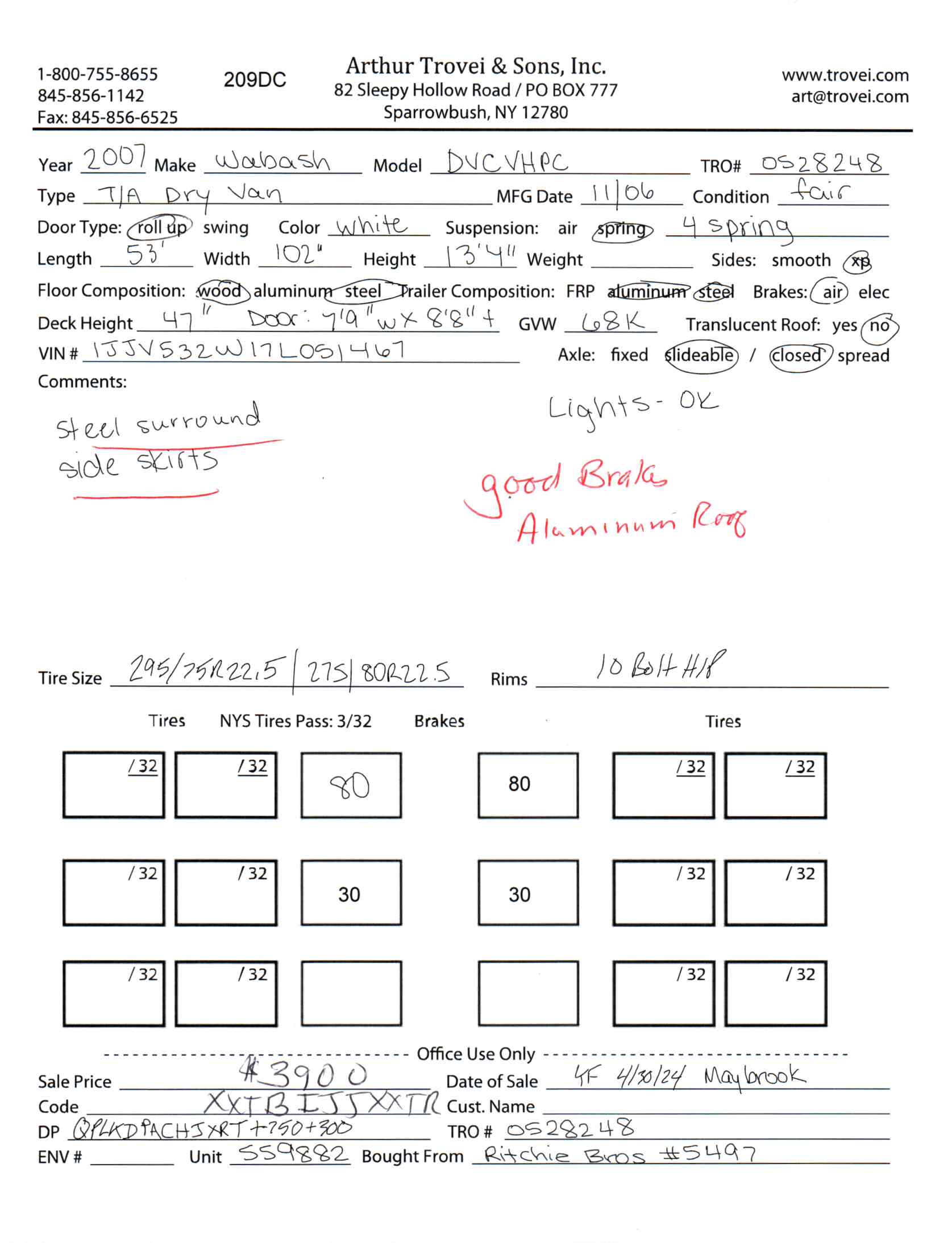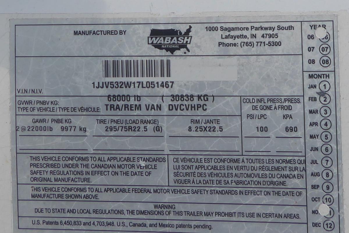 Inventory # 0528248Year: 2007 Make: Wabash Model: DVCVHPC Axles: Slideable Closed Tandem Type: Dry Box Trailer VIN: 1JJV532W17L051467 Suspension: 4 Spring Tires: 275/80R22.5 / 295/75R22.5 Rims: 10 Bolt Hub Pilot - Steel Length: 53' Width: 102" Height: 13'4" Weight (Estimated): 15,460 lbs Load Width: 7'9" Load Height: 8'8" GVWR: 68,000 lb Trailer Composition: Aluminum / Steel Floor Composition: Wood / Steel Door Type: Roll Up Door - Steel Surround Added Details: Aluminum Roof, Air Brakes, Side Windows, Side Skirts Price: $3,900 209DCXXTBIJJXXTRQRTVDPACHJXRT+750+300 Terms of Sale