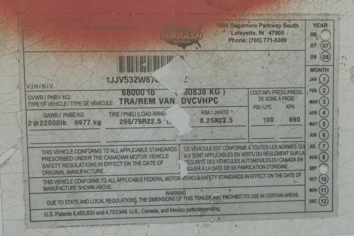 Inventory # 0528249Year: 2007 Make: Wabash Model: DVCVHPC Axles: Slideable Closed Tandem Type: Dry Box Trailer VIN: 1JJV532W67L050542 Suspension: 4 Spring Tires: 275/80R22.5 / 295/75R22.5 Rims: 10 Bolt Hub Pilot - Steel Length: 53' Width: 102" Height: 13'4" Weight (Estimated): 15,460 lbs Load Width: 7'9" Load Height: 8'8" GVWR: 68,000 lb Trailer Composition: Aluminum / Steel Floor Composition: Wood / Steel Door Type: Roll Up Door - Steel Surround Added Details: Aluminum Roof, Air Brakes, Side Windows, Side Skirts Price: $3,900 209DCXXTCBJJXXTRQRTVDPAFAJXRT+750+300 Terms of Sale