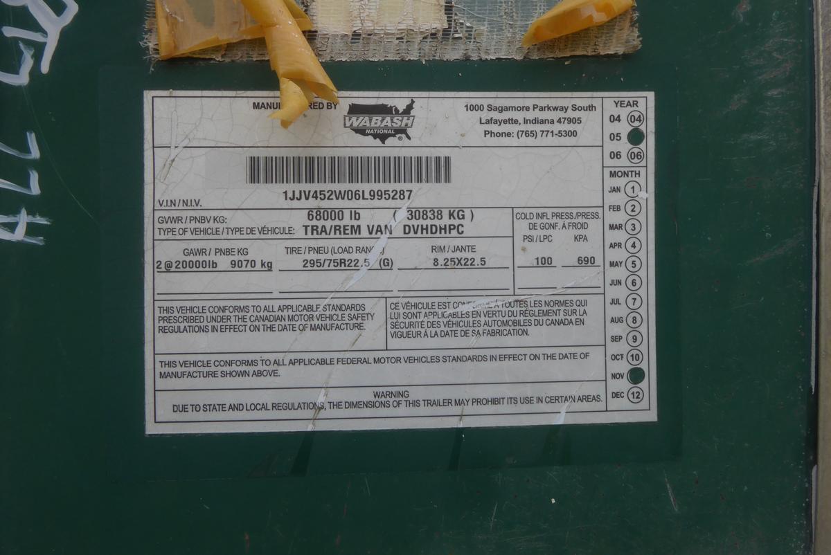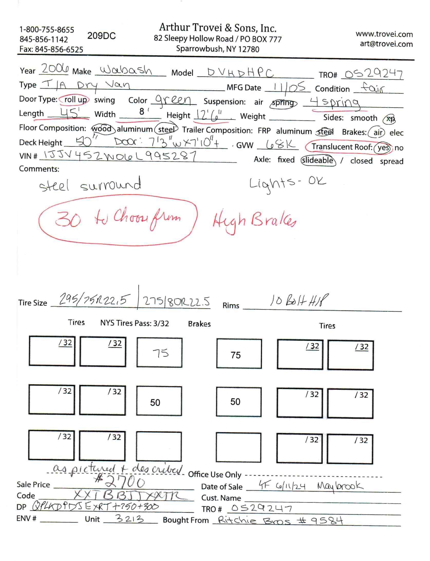 Inventory # 0529247Year: 2006 Make: Wabash Model: DVHDHPC Axles: Slideable Closed Tandem Type: Dry Box Trailer VIN: 1JJV452W06L995287 Suspension: 4 Spring Tires: 275/80R22.5 / 295/75R22.5 Rims: 10 Bolt Hub Pilot - All Steel Length: 45' Width: 8' Height: 12'6" Weight (Estimated): 13,260 lb Load Width: 7'3" Load Height: 7'10" GVWR: 68,000 lb Trailer Composition: Aluminum / Steel Floor Composition: Wood / Steel Door Type: Roll Up Door - Steel Surround Added Details: Air Brakes, Translucent Roof Price: $2,700 as described 209DCXXTBBJJXXTRQPLKDPDJEXRT+750+300 Terms of Sale