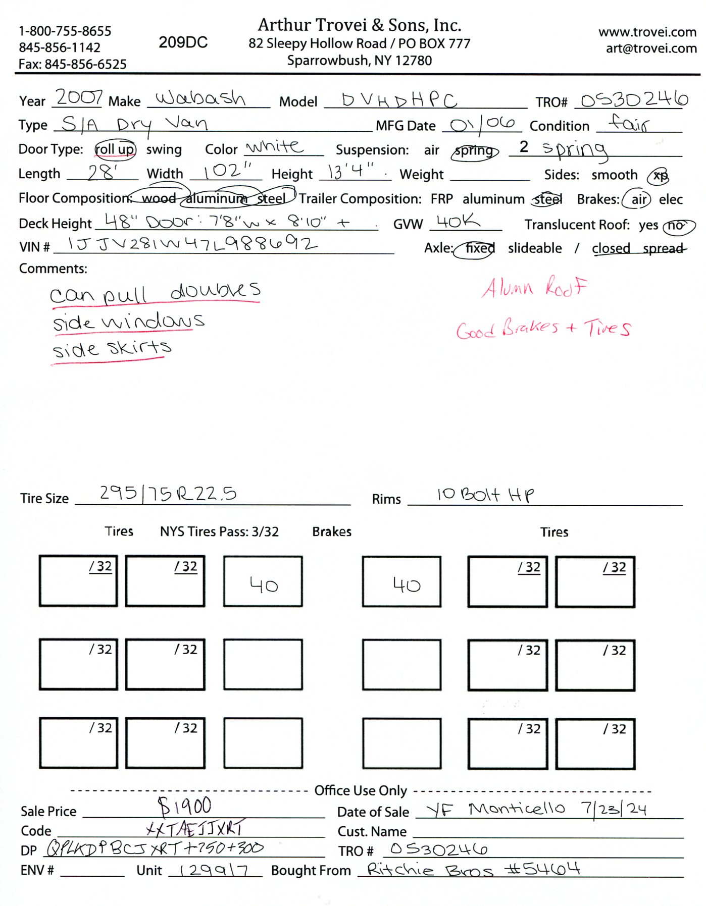 Inventory # 0530246Year: 2007 Make: Wabash Model: DVHDHPC Axles: Fixed single Type: Dry box trailer VIN: 1JJV281W47L988692 Suspension: 2 Spring Tires: 295/75R22.5 Rims: 10 Bolt Hub Pilot - Steel Length: 28' Width: 102" Height: 13'4" Weight (Estimated): 8,760 lb GVW: 40,000 lb Floor Composition: Wood / Steel / Aluminum Trailer Composition: Steel Door Type: Roll Up - Steel Surround Door Opening Width: 7'8" Door Opening Height: 8'10" Added Details: Air Brakes, Can Pull Doubles, Aluminum Roof, Side Windows, Side Skirts, Vertical Logistics, Some Aluminum Crossmembers Price: $1,900 209DCXXTAEJJXXTQRTVDPBCJXRT+750+300 Terms of Sale