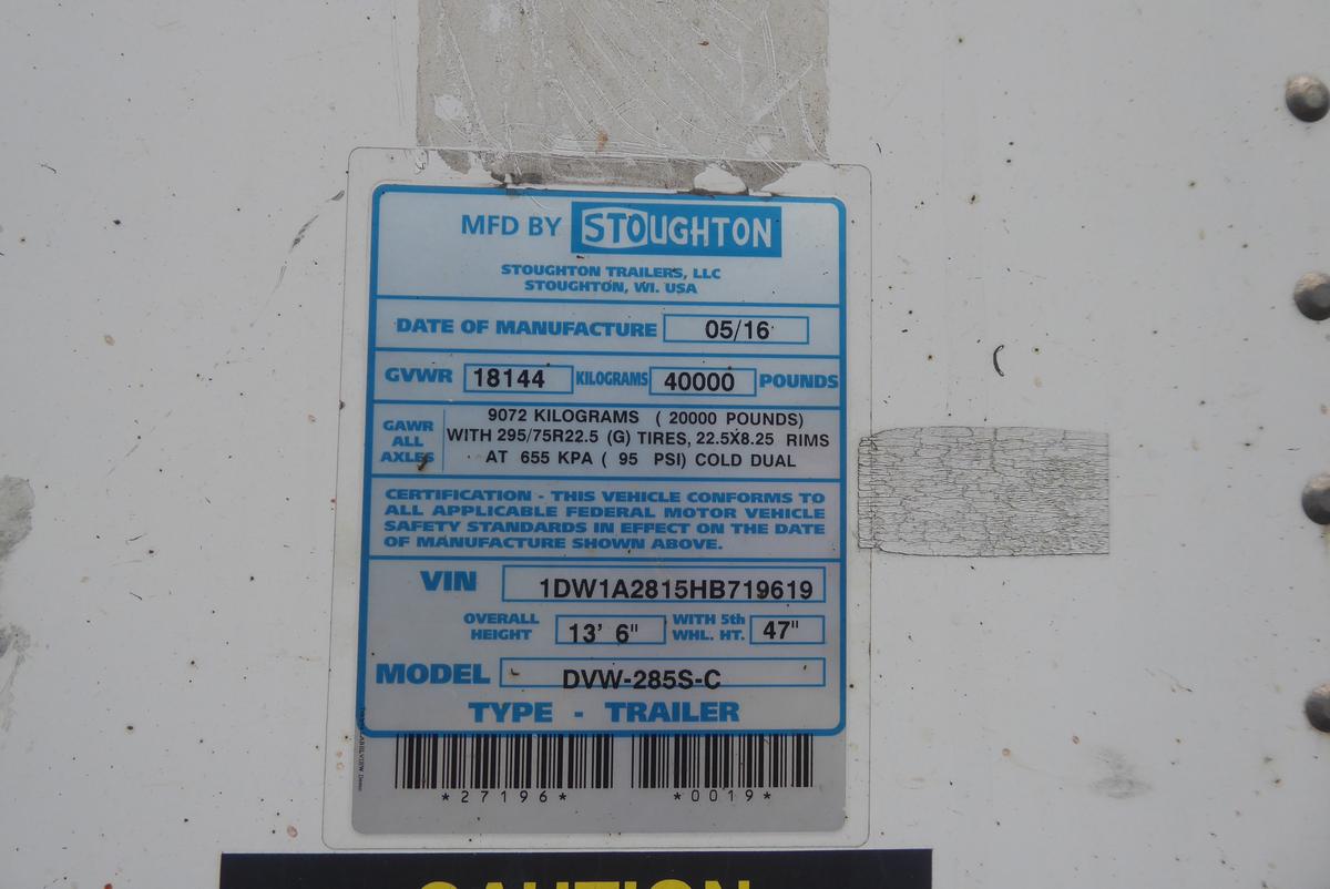 Inventory # 0531244Year: 2017 Make: Stoughton Model: DVW-285S-C Axles: Fixed Single Type: Dry Box Trailer VIN: 1DW1A2815HB719619 Suspension: 2 Spring Tires: 295/75R22.5 Rims: 10 Bolt Hub Pilot - Steel Length: 28' Width: 102" Height: 13'6" Weight (Estimated): 8,260 lb GVW: 40,000 lb Floor Composition: Wood / Steel Trailer Composition: Aluminum Door Type: Roll Up - Stainless Surround Door Opening Width: 7'9" Door Opening Height: 8'9" Added Details: Air Brakes, Can Pull Doubles, Side Windows, Side Skirts, Aluminum Roof, Tire Inflation System Price: $3,900 209DCXXTBIJJXXTQPLKDPDIEXRT+750+300 Terms of Sale
