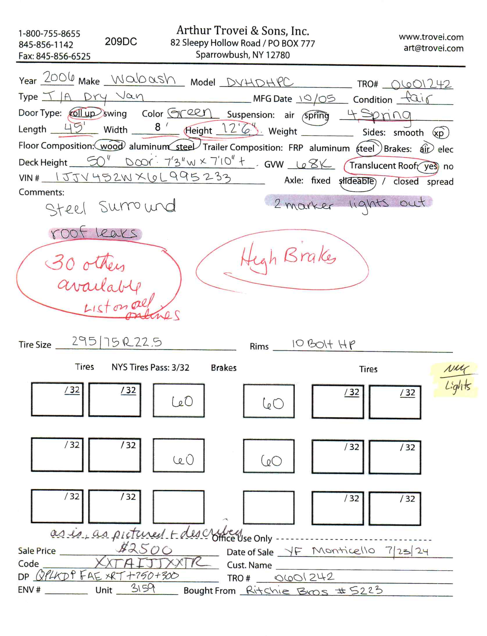 Inventory # 0601242Year: 2006 Make: Wabash Model: DVHDHPC Axles: Slideable Closed Tandem Type: Dry Box Trailer VIN: 1JJV452WX6L995233 Suspension: 4 Spring Tires: 275/80R22.5 / 295/75R22.5 Rims: 10 Bolt Hub Pilot - All Steel Length: 45' Width: 8' Height: 12'6" Weight (Estimated): 13,260 lb Load Width: 7'3" Load Height: 7'10" GVWR: 68,000 lb Trailer Composition: Aluminum / Steel Floor Composition: Wood / Steel Door Type: Roll Up Door - Steel Surround Added Details: Air Brakes, Translucent Roof (Leaks) Price: $2,500 as described NNY 209DCXXTAIJJXXTRQPLKDPFAEXRT+750+300 Terms of Sale