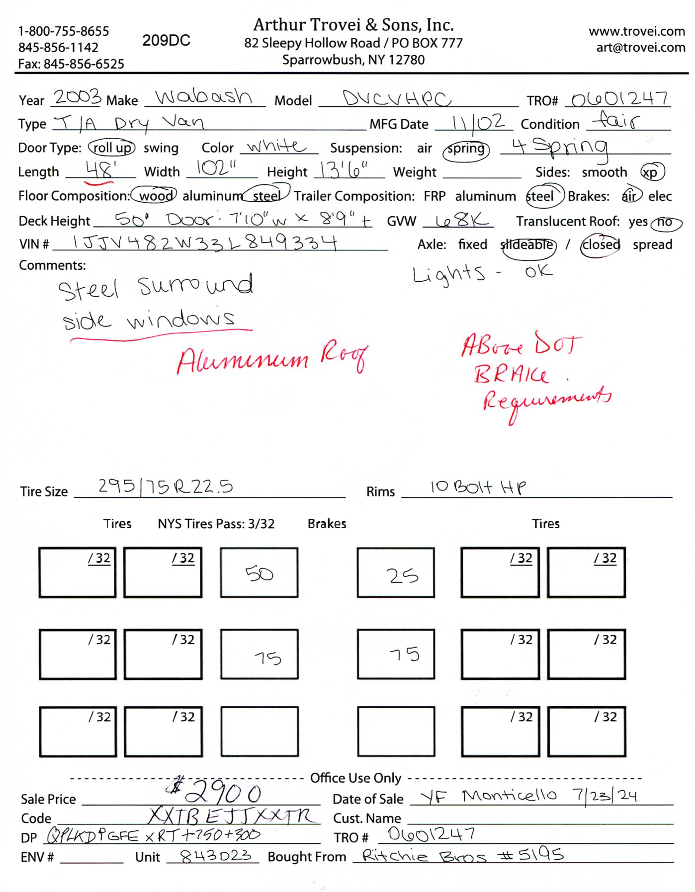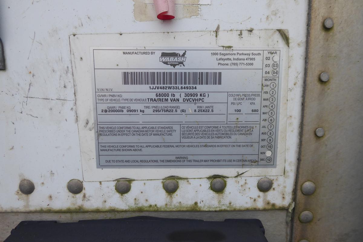 Inventory # 0601247Year: 2003 Make: Wabash Model: DVCVHPC Axles: Slideable Closed Tandem Type: Dry Box Trailer VIN: 1JJV482W33L849334 Suspension: 4 Spring Tires: 295/75R22.5 Rims: 10 Bolt Hub Pilot - Steel Length: 48' Width: 102" Height: 13'6" Load Width: 7'10" Load Height: 8'9" Weight (Estimated): 13,980 lb GVWR: 68,000 lb Trailer Composition: Steel Floor Composition: Wood / Steel Door Type: Roll Up Door - Steel Surround Added Details: Air Brakes, Aluminum Roof Price: $2,900 209DCXXTBEJJXXTRQPLKDPGFEXRT+750+300 Terms of Sale