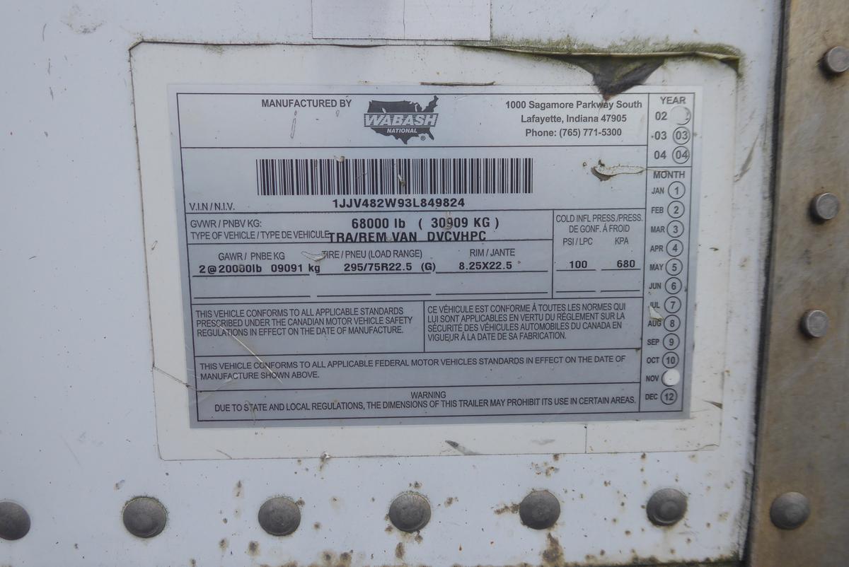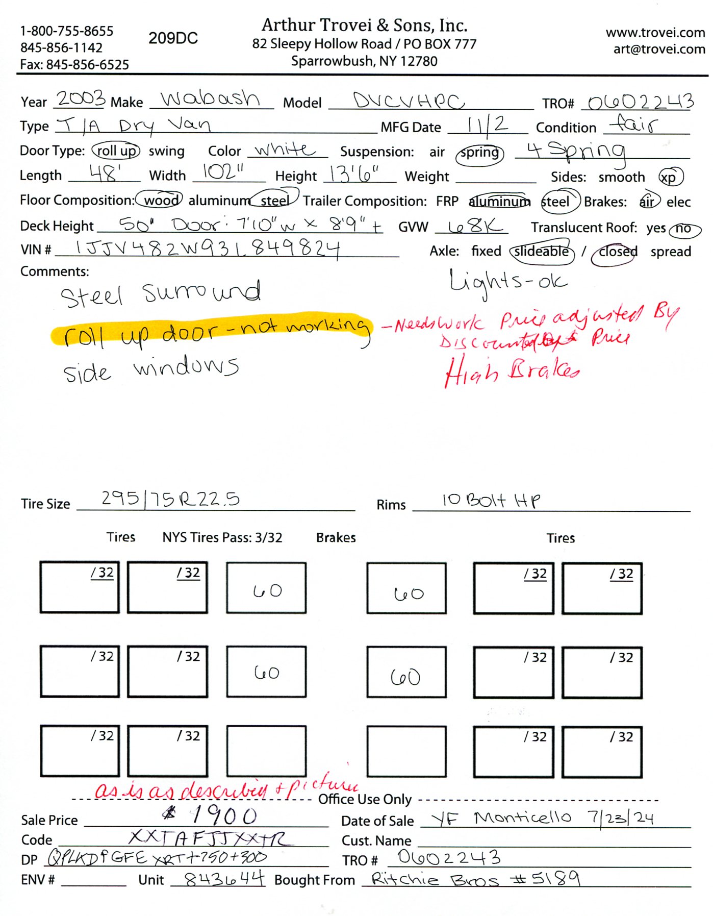 Inventory # 0602243Year: 2003 Make: Wabash Model: DVCVHPC Axles: Slideable Closed Tandem Type: Dry Box Trailer VIN: 1JJV482W93L849824 Suspension: 4 Spring Tires: 295/75R22.5 Rims: 10 Bolt Hub Pilot - Steel Length: 48' Width: 102" Height: 13'6" Load Width: 7'10" Load Height: 8'9" Weight (Estimated): 13,980 lb GVWR: 68,000 lb Trailer Composition: Aluminum / Steel Floor Composition: Wood / Steel Door Type: Roll Up Door - Steel Surround (Not Working) Added Details: Air Brakes, Aluminum Roof, Side Windows Price: $1,900 as is as described 209DCXXTAFJJXXTRQPLKDPGFEXRT+750+300 Terms of Sale