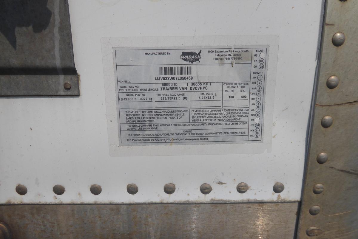 Inventory # 0609241Year: 2007 Make: Wabash Model: DVCVHPC Axles: Slideable Closed Tandem Type: Dry Box Trailer VIN: 1JJV532W07L050469 Suspension: 4 Spring Tires: 295/75R22.5 Rims: 10 Bolt Hub Pilot - Steel Length: 53' Width: 102" Height: 13'4" Load Width: 7'9" Load Height: 8'8" Weight (Estimated): 15,460 lb GVWR: 68,000 lb Trailer Composition: Aluminum / Steel Floor Composition: Wood / Steel Door Type: Roll Up Door - Steel Surround (Works Hard) Added Details: Aluminum Roof, Air Brakes, Side Windows, Side Skirts Price: $2,900 209DCXXTBEJJXXTRQRTVDPAIEEXRT+750+300 Terms of Sale
