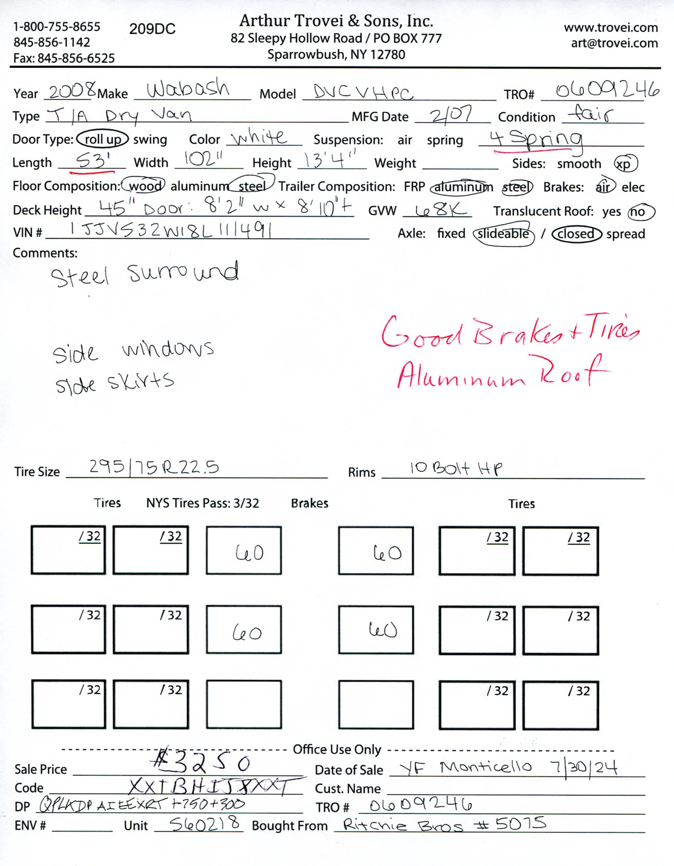 Inventory # 0609246Year: 2008 Make: Wabash Model: DVCVHPC Axles: Slideable Closed Tandem Type: Dry Box Trailer VIN: 1JJV532W18L111491 Suspension: 4 Spring Tires: 295/75R22.5 Rims: 10 Bolt Hub Pilot - Steel Length: 53' Width: 102" Height: 13'4" Load Width: 8'2" Load Height: 8'10" Weight (Estimated): 14,760 lb GVWR: 68,000 lb Trailer Composition: Aluminum / Steel Floor Composition: Wood / Steel Door Type: Roll Up Door - Steel Surround Added Details: Vertical Logistics, Alumium Roof, Side Windows, Side Skirts Price: $3,250 209DCXTRBHIJXXTQPLKDPAIEEXRT+750+300 Terms of Sale