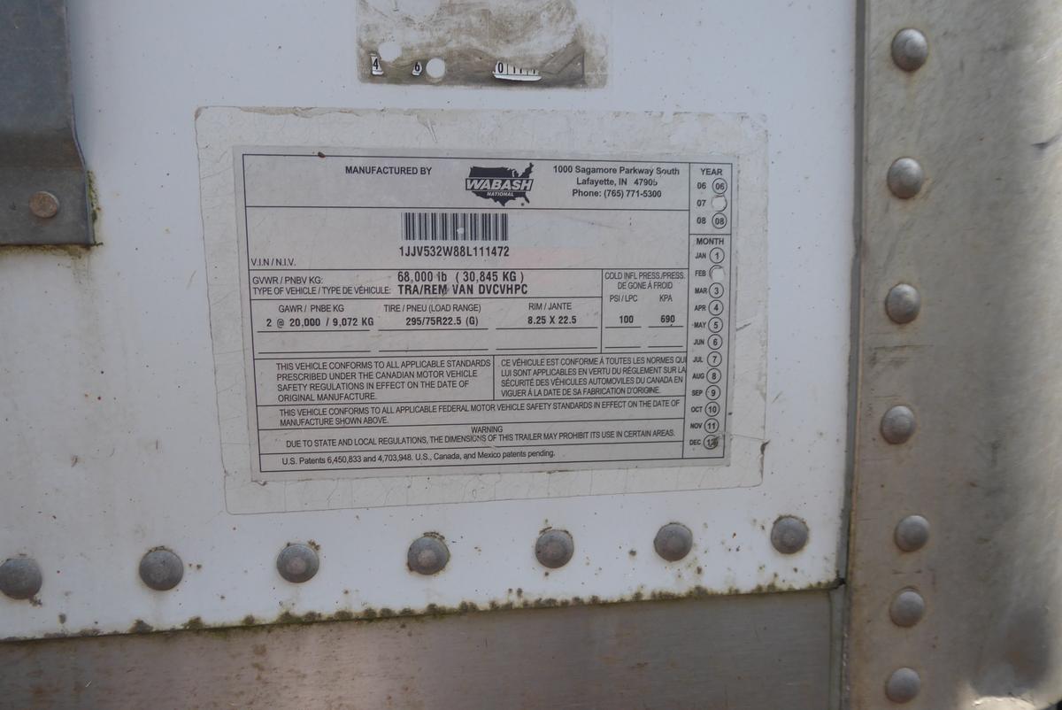 Inventory # 0610246Year: 2008 Make: Wabash Model: DVCVHPC Axles: Slideable Closed Tandem Type: Dry Box Trailer VIN: 1JJV532W88L111472 Suspension: 4 Spring Tires: 295/75R22.5 Rims: 10 Bolt Hub Pilot - Steel Length: 53' Width: 102" Height: 13'4" Load Width: 8'2" Load Height: 8'10" Weight (Estimated): 14,760 lb GVWR: 68,000 lb Trailer Composition: Aluminum / Steel Floor Composition: Wood / Steel Door Type: Roll Up Door - Steel Surround Added Details: Vertical Logistics, Aluminum Roof, Side Windows, Side Skirts, Plug Broken For Lights Price: $2,900 as is as described NNY 209DCXTRBBJJXXTQPLKDPAIJJXRT+750+300 Terms of Sale