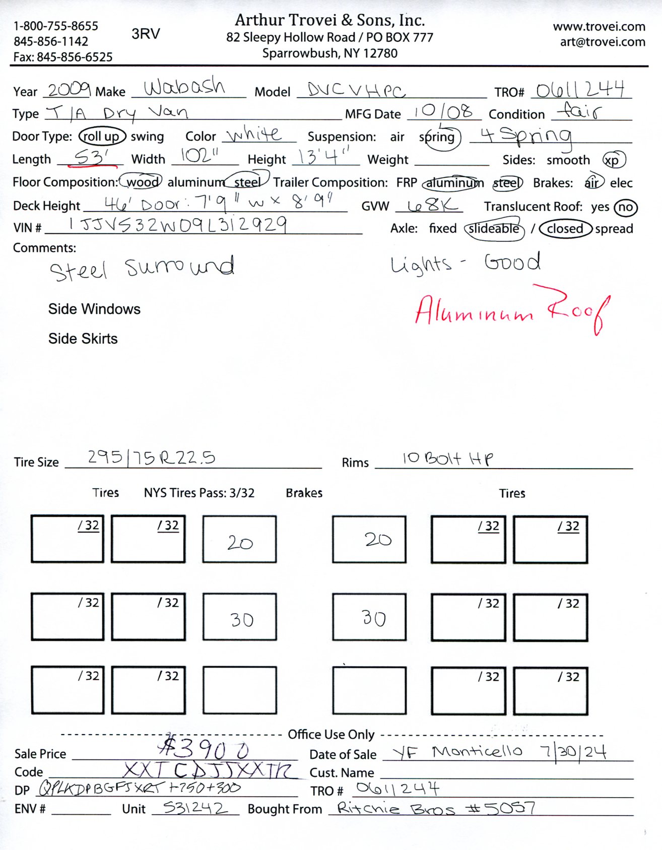 Inventory # 0611244Year: 2009 Make: Wabash Model: DVCVHPC Axles: Slideable Closed Tandem Type: Dry Box Trailer VIN: 1JJV532W09L312929 Suspension: 4 Spring Tires: 295/75R22.5 Rims: 10 Bolt Hub Pilot - Steel Length: 53' Width: 102" Height: 13'4" Load Width: 7'9" Load Height: 8'9" Weight (Estimated): 14,760 lb GVWR: 68,000 lb Trailer Composition: Aluminum / Steel Floor Composition: Wood / Steel Door Type: Roll Up Door - Steel Surround Added Details: Vertical Logistics, Aluminum Roof, Side Windows, Side Skirts Price: $3,900 3RVXXTCDJJXXTRQPLKDPBGFJXRT+750+300 Terms of Sale