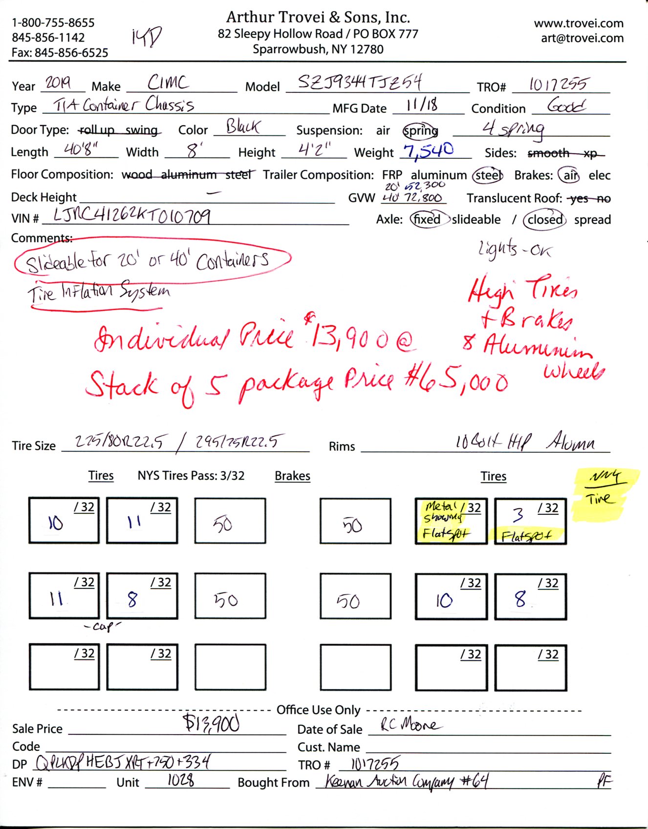 Inventory # 1017255Year: 2019 Make: CIMC Model: SZJ9344TJZ54 Axles: Tandem Axle Fixed Closed Type: Extendable Container Chassis VIN: LJRC41262KT010709 Suspension: 4 Spring Tires: 275/80R22.5 / 295/75R22.5 Rims: 10 Bolt Hub Pilot Length: 40'8" Width: 8' Height: 4'2" Weight: 7,540 lb Trailer Composition: Steel Added Details: Extends From 20' to 40', Tire Inflation System Price (Individual): $13,900 NNY Price (Stack Of 5): $65,900 1YDQPLKDPHEBJXRT+750+334 Terms of Sale