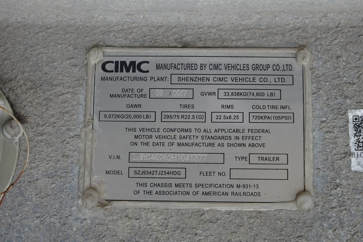 Inventory # 1020254Year: 2017 Make: CIMC Model: SZJ9342TJZ54HDG Axles: Tandem Axle Fixed Closed Type: Extendable Container Chassis VIN: LJRC46262H1041377 Suspension: 4 Spring Tires: 275/80R22.5 / 295/75R22.5 Rims: 10 Bolt Hub Pilot Length: 40'8" Width: 8' Height: 4'2" Weight: 7,070 lb Trailer Composition: Steel Added Details: Extends From 40' to 45', Tire Inflation System Price (Individual): $12,900 Price (Stack Of 2): $22,000 Price (Stack Of 4): $39,600 1YDXXTAJIJJXXTRQPLKDPBHDEXRT+750+500 Terms of Sale