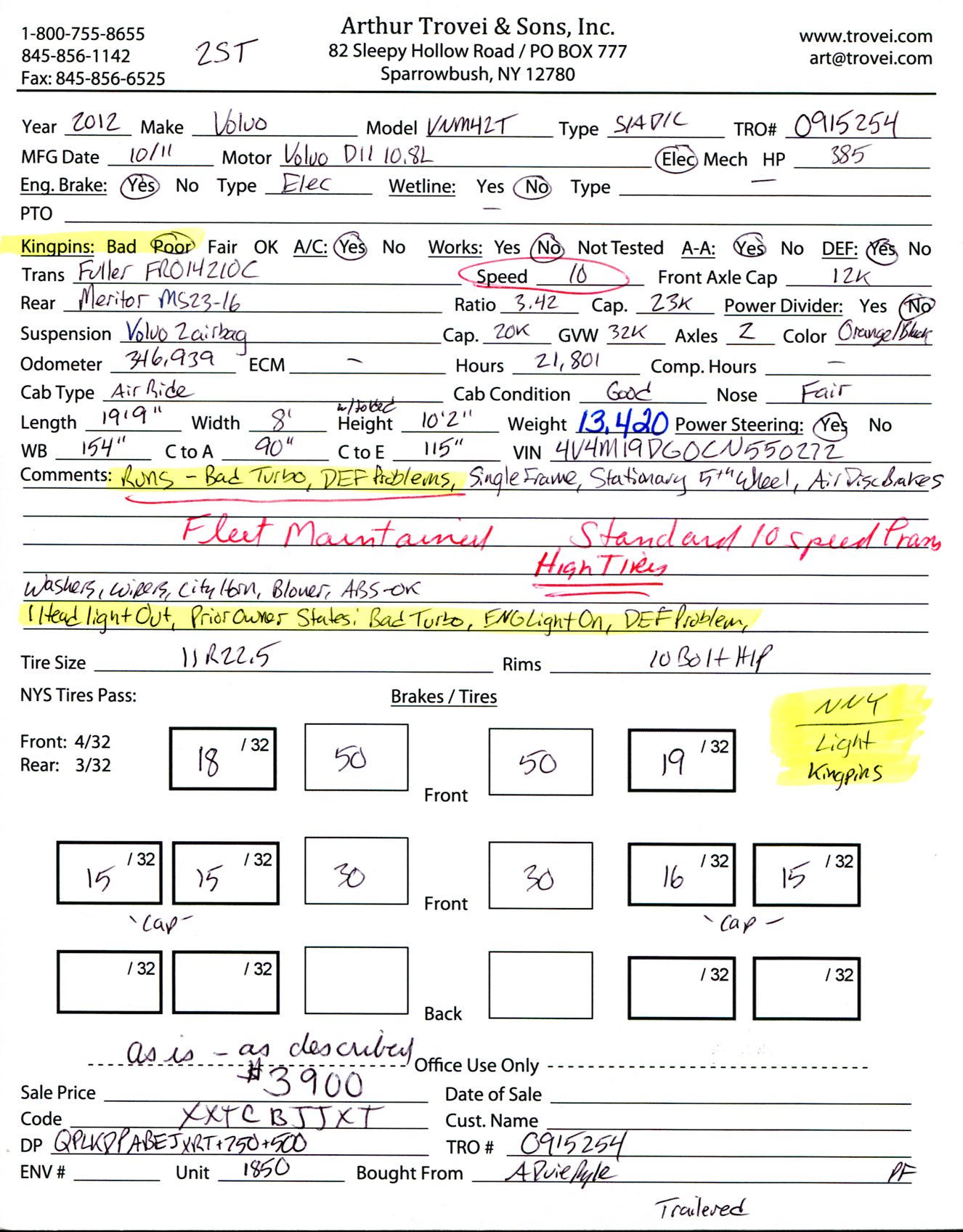 ![]() ![]() ![]() ![]() ![]() ![]() ![]() ![]() ![]() ![]() 2012 Volvo VNM42T Single Axle Day Cab Tractor![]() Year: 2012 Make: Volvo Model: VNM42T Type: Single Axle Day Cab Tractor VIN: 4V4M19DG0CN550272 Motor: Volvo D11 10.8L Elec 385 HP - Engine Light On, Bad Turbo, DEF Problem Air to Air: Yes Air Conditioning: Yes (Not Working) Engine Brake: Electronic DEF: Yes Transmission: Fuller FRO14210C 10 Speed PTO: No Front Axle: 12,000 lb Rear: Meritor MS23-16 23,000 lb Ratio: 3.42 Power Divider: No Suspension: Volvo 2 Air Bag 20,000 lb Tires: 11R22.5 Rims: 10 Bolt Hub Pilot - Steel Odometer Reading: 346,939 ECM: Hour Meter Reading: 21,801 ECM Hour Reading: Length: 19'9" Width: 8' Height w/ Fairing Folded: 10'2" Wheelbase: 154" Cab to Axle: 90" Cab to End: 115" Weight: 13,420 lb GVW: 32,000 lb Added Features: Runs Well - Engine Light On, Bad Turbo, DEF Problem, Single Frame, Stationary 5th Wheel, Air Disc Brakes Price: $3,900 as is as described NNY 2STXXTCBJJXTQPLKDPABEJXRT+750+500 Terms of Sale