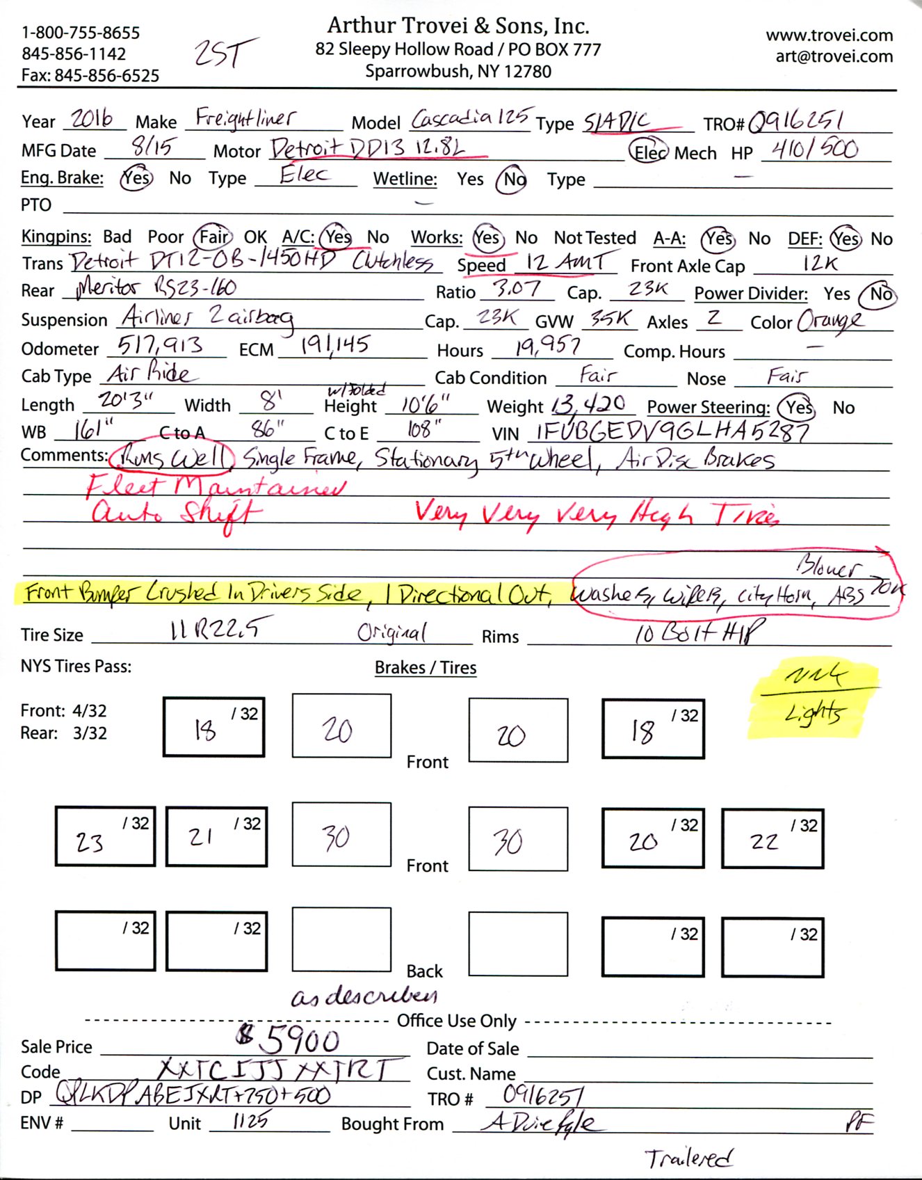 ![]() ![]() ![]() ![]() ![]() ![]() ![]() ![]() ![]() ![]() ![]() ![]() ![]() ![]() 2016 Freightliner Cascadia 125 Single Axle Day Cab Tractor![]() Year: 2016 Make: Freightliner Model: Cascadia 125 Type: Single Axle Day Cab Tractor VIN: 1FUBGEDV9GLHA5287 Motor: Detroit DD13 12.8L Elec 410/500 HP Air to Air: Yes Air Conditioning: Yes (Works) Engine Brake: Electronic DEF: Yes Transmission: Detroit DT12-0B-1450HD Clutchless 12 Speed Automated Manual PTO: No Front Axle: 12,000 lb Rear: Meritor RS23-160 23,000 lb Ratio: 3.07 Power Divider: No Suspension: Airliner 2 Air Bag 23,000 lb Tires: 11R22.5 Rims: 10 Bolt Hub Pilot - Steel Odometer Reading: 517,913 ECM: 191,145 Hour Meter Reading: 19,957 ECM Hour Reading: Length: 20'3" Width: 8' Height: 10'6" Wheelbase: 161" Cab to Axle: 86" Cab to End: 108" Weight: 13,420 lb GVW: 35,000 lb Added Features: Runs Well, Single Frame, Stationary 5th Wheel, Air Disc Brakes Price: $5,900 as described NNY 2STXXTCIJJXXTRTQPLKDPABEJXRT+750+500 Terms of Sale