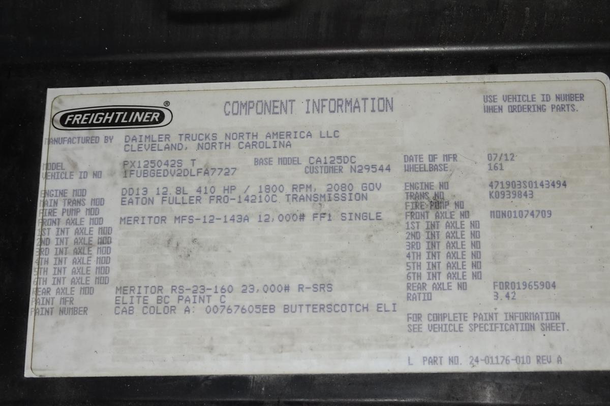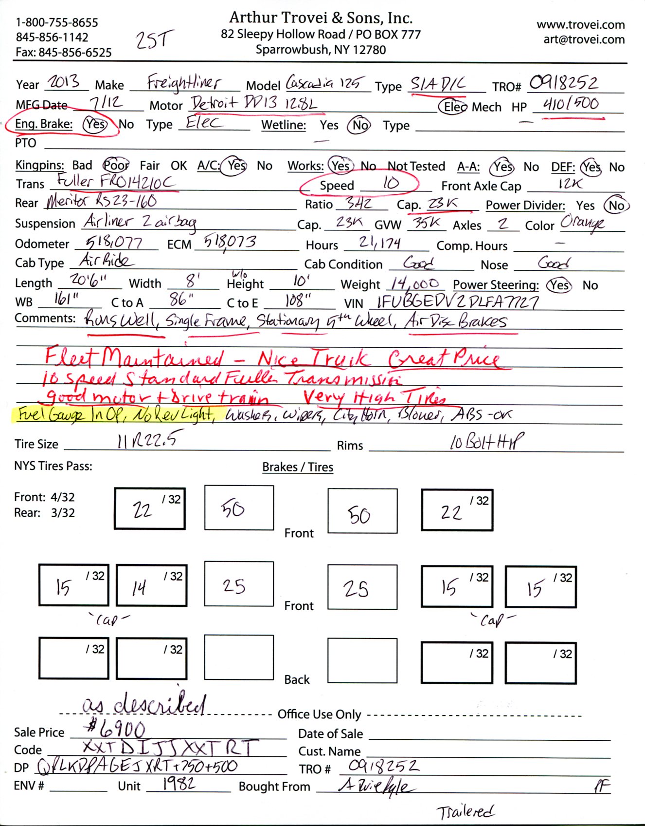 ![]() ![]() ![]() ![]() ![]() ![]() ![]() ![]() ![]() ![]() ![]() ![]() 2013 Freightliner Cascadia 125 Single Axle Day Cab Tractor![]() Year: 2013 Make: Freightliner Model: Cascadia 125 Type: Single Axle Day Cab Tractor VIN: 1FUBGEDV2DLFA7727 Motor: Detroit DD13 12.8L Elec 410/500 HP Air to Air: Yes Air Conditioning: Yes (Works) Engine Brake: Electronic DEF: Yes Transmission: Fuller FRO14210C 10 Speed PTO: No Front Axle: 12,000 lb Rear: Meritor RS23-160 23,000 lb Ratio: 3.42 Power Divider: No Suspension: Airliner 2 Air Bag 23,000 lb Tires: 11R22.5 Rims: 10 Bolt Hub Pilot - Steel Odometer Reading: 518,077 ECM: 518,073 Hour Meter Reading: 21,174 ECM Hour Reading: Length: 20'6" Width: 8' Height: 10' Wheelbase: 161" Cab to Axle: 86" Cab to End: 108" Weight: 14,000 lb GVW: 35,000 lb Added Features: Runs Well, Single Frame, Stationary 5th Wheel, Air Disc Brakes Price: $6,900 as described 2STXXTDIJJXXTRQPLKDPAGEJXRT+750+500 Terms of Sale