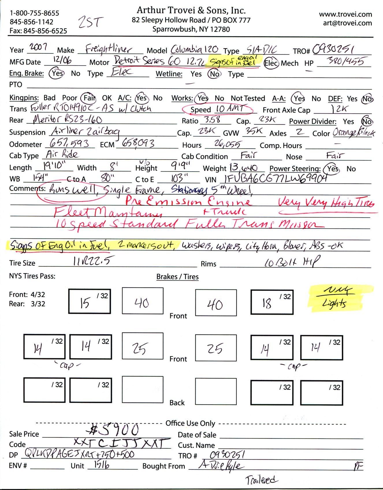 ![]() ![]() ![]() ![]() ![]() ![]() ![]() ![]() ![]() ![]() ![]() ![]() 2007 Freightliner Columbia 120 Single Axle Day Cab Tractor![]() Year: 2007 Make: Freightliner Model: Columbia 120 Type: Single Axle Day Cab Tractor VIN: 1FUBA6CG77LW69904 Motor: Detroit Series 60 12.7L Elec 380/455 HP - Signs Of Oil In Fuel Air to Air: Yes Air Conditioning: Yes (Works) Engine Brake: Electronic DEF: No Transmission: Fuller RTO14910C-AS 10 Speed Automated Manual Transmission With Clutch PTO: No Front Axle: 12,000 lb Rear: Meritor RS23-160 23,000 lb Ratio: 3.58 Power Divider: N/A Suspension: Airliner 2 Air Bag 23,000 lb Tires: 11R22.5 Rims: 10 Bolt Hub Pilot - Steel Odometer Reading: 657,593 ECM: 658,093 Hour Meter Reading: 26,055 ECM Hour Reading: Length: 19'10" Width: 8' Height: 9'9" Wheelbase: 154" Cab to Axle: 80" Cab to End: 103" Weight: 13,640 lbs GVW: 35,000 lb Added Features: Runs Well, Single Frame, Stationary 5th Wheel Price: $5,900 NNY 2STXXTCIJJXXTQPLKDPAGEJXRT+750+500 Terms of Sale