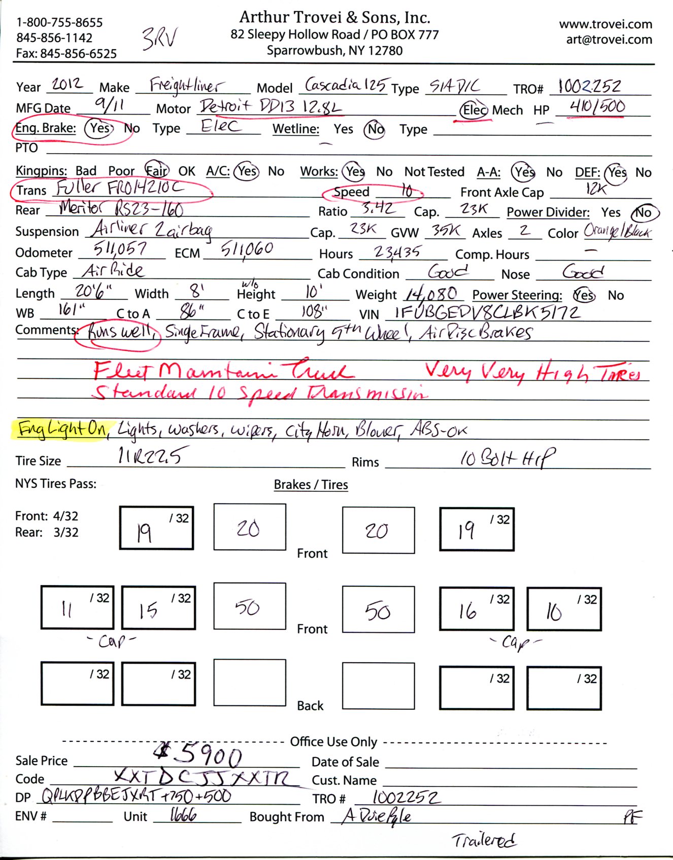 Inventory # 1002252Year: 2012 Make: Freightliner Model: Cascadia 125 Type: Single Axle Day Cab Tractor VIN: 1FUBGEDV8CLBK5172 Motor: Detroit DD13 12.8L Elec 410/500 HP Air to Air: Yes Air Conditioning: Yes (Works) Engine Brake: Electronic DEF: Yes Transmission: Fuller FRO14210C 10 Speed PTO: No Front Axle: 12,000 lb Rear: Meritor RS23-160 23,000 lb Ratio: 3.42 Power Divider: No Suspension: Airliner 2 Air Bag 23,000 lb Tires: 11R22.5 Rims: 10 Bolt Hub Pilot - Steel Odometer Reading: 511,057 ECM: 511,060 Hour Meter Reading: 23,435 ECM Hour Reading: Length: 20'6" Width: 8' Height: 10' Wheelbase: 161" Cab to Axle: 86" Cab to End: 108" Weight: 14,080 lb GVW: 35,000 lb Added Features: Runs Well, Single Frame, Stationary 5th Wheel, Air Disc Brakes Price: $5,900 3RVXXTDCJJXXTRQPLKDPBBEJXRT+750+500 Terms of Sale