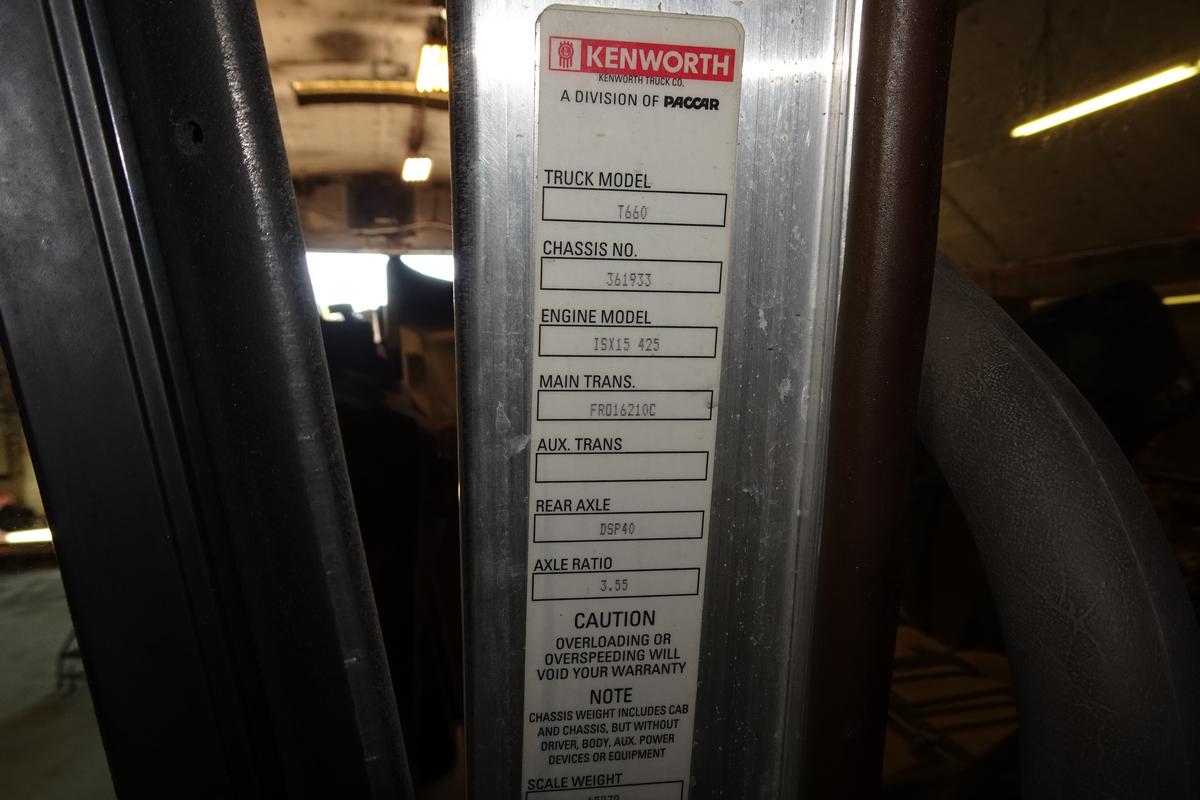 Inventory # 1003252Year: 2013 Make: Kenworth Model: T660 Type: Tandem Axle Day Cab Tractor VIN: 1XKAD49X6DJ361933 Motor: Cummins ISX 15.0L Elec 425 HP (New Oil Pan) Air to Air: Yes Air Conditioning: Yes (Not Working) Engine Brake: Electronic DEF: Yes Transmission: Fuller FRO16210C 10 Speed PTO: Air Operated Passenger Side With Shaft To Fuel Transfer Pump Front Axle: 12,000 lb Rear: Spicer DSP40 40,000 lb Ratio: 3.55 Power Divider: Yes Suspension: Paccar 4 air bag 36,000 lb Tires: 11R22.5 Rims: 10 Bolt Hub Pilot - Aluminum Odometer Reading: 22,593 (Odometer Changed At 585,551. 608,144 Total) ECM: Hour Meter Reading: 17,796 ECM Hour Reading: Length: 26' Width: 8' Height: 10' Wheelbase: 200" Cab to Axle: 123" Cab to End: 176" Weight: 16,440 lb GVW: 48,000 lb Added Features: Runs Well, Single Frame, Stationary 5th Wheel Price: $21,900 as described NNY 3RVXXTAHIJJXXTRTQPLKDPIJJJXRT+750+1250+900 Terms of Sale