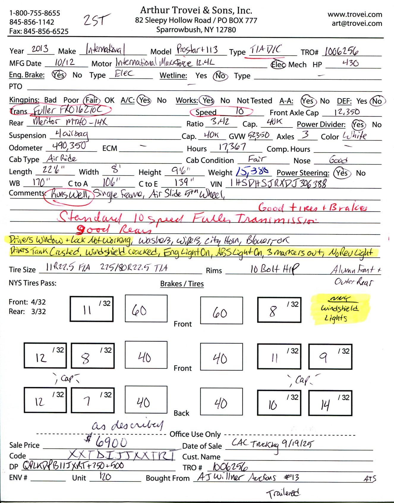 ![]() ![]() ![]() ![]() ![]() ![]() ![]() ![]() ![]() ![]() ![]() ![]() 2013 International Prostar+ 113 Tandem Axle Day Cab Tractor![]() Year: 2013 Make: International Model: Prostar+ 113 Type: Tandem Axle Day Cab Tractor VIN: 1HSDHSJRXDJ306388 Motor: International Maxxforce 12.4L Elec 430 HP Air to Air: Yes Air Conditioning: Yes (Works) Engine Brake: Electronic DEF: Yes Transmission: Fuller FRO16210C 10 Speed PTO: No Front Axle: 12,350 lb Rear: Meritor MT40-14X 40,000 lb Ratio: 3.42 Power Divider: Yes Suspension: 4 Air Bag 40,000 lb Tires: 11R22.5 F/A 275/80R22.5 T/A Rims: 10 Bolt Hub Pilot - Aluminum Front And Outer Rear Odometer Reading: 490,350 ECM: Hour Meter Reading: 17,367 ECM Hour Reading: Length: 22'6" Width: 8' Height: 9'5" Wheelbase: 170" Cab to Axle: 106" Cab to End: 139" Weight: 15,380 lb GVW: 52,350 lb Added Features: Runs Well, Single Frame, Air Slide 5th Wheel Price: $6,900 as described NNY 2STXXTDIJJXXTRQPLKDPBIIJXRT+750+500 Terms of Sale