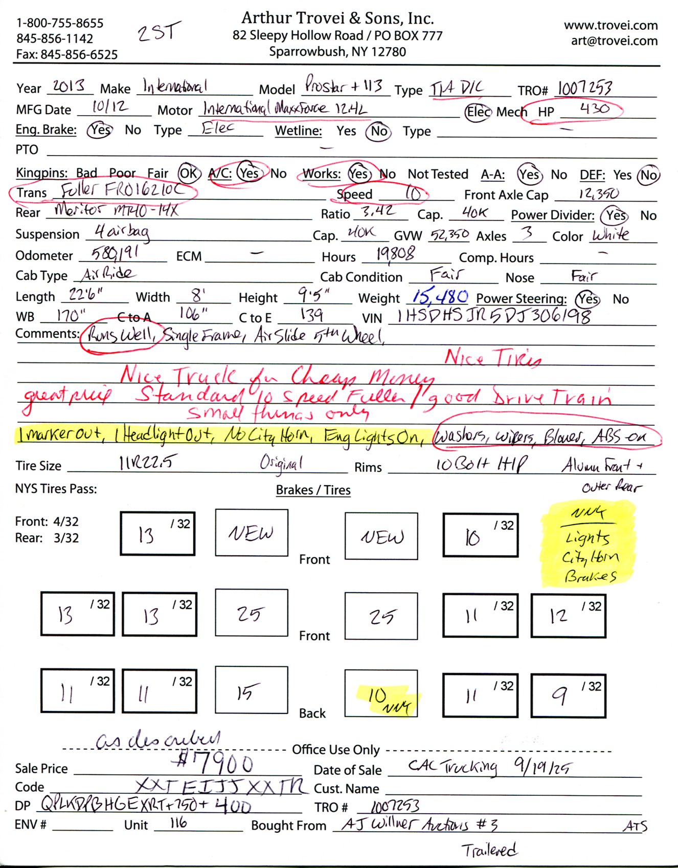![]() ![]() ![]() ![]() ![]() ![]() ![]() ![]() ![]() ![]() ![]() ![]() 2013 International Prostar+ 113 Tandem Axle Day Cab Tractor![]() Year: 2013 Make: International Model: Prostar+ 113 Type: Tandem Axle Day Cab Tractor VIN: 1HSDHSJR5DJ306198 Motor: International Maxxforce 12.4L Elec 430 HP Air to Air: Yes Air Conditioning: Yes (Works) Engine Brake: Electronic DEF: Yes Transmission: Fuller FRO16210C 10 Speed PTO: No Front Axle: 12,350 lb Rear: Meritor MT40-14X 40,000 lb Ratio: 3.42 Power Divider: Yes Suspension: 4 Air Bag 40,000 lb Tires: 11R22.5 Rims: 10 Bolt Hub Pilot - Aluminum Front And Outer Rear Odometer Reading: 580,191 ECM: Hour Meter Reading: 19,808 ECM Hour Reading: Length: 22'6" Width: 8' Height: 9'5" Wheelbase: 170" Cab to Axle: 106" Cab to End: 139" Weight: 15,480 lb GVW: 52,350 lb Added Features: Runs Well, Single Frame, Air Slide 5th Wheel Price: $7,900 as described NNY 2STXXTEIJJXXTRQPLKDPBHGEXRT+750+400 Terms of Sale