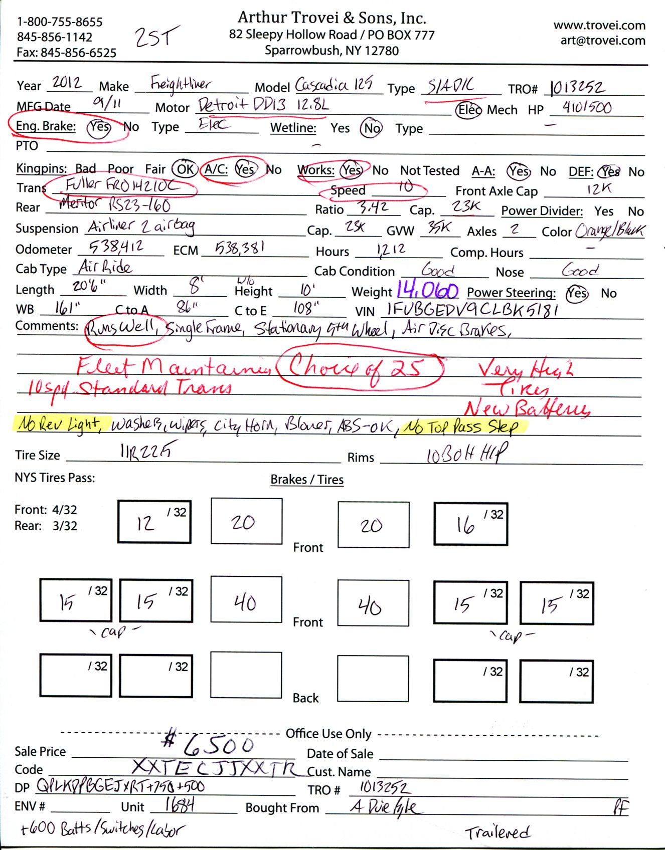 Inventory # 1013252Year: 2012 Make: Freightliner Model: Cascadia 125 Type: Single Axle Day Cab Tractor VIN: 1FUBGEDV9CLBK5181 Motor: Detroit DD13 12.8L Elec 410/500 HP Air to Air: Yes Air Conditioning: Yes (Works) Engine Brake: Electronic DEF: Yes Transmission: Fuller FRO14210C 10 Speed PTO: No Front Axle: 12,000 lb Rear: Meritor RS23-160 23,000 lb Ratio: 3.42 Power Divider: No Suspension: Airliner 2 Air Bag 23,000 lb Tires: 11R22.5 Rims: 10 Bolt Hub Pilot - Steel Odometer Reading: 538,412 ECM: 538,381 Hour Meter Reading: 1,212* ECM Hour Reading: Length: 20'6" Width: 8' Height: 10' Wheelbase: 161" Cab to Axle: 86" Cab to End: 108" Weight: 14,060 lb GVW: 35,000 lb Added Features: Runs Well, Single Frame, Stationary 5th Wheel, Air Disc Brakes Price: $6,500 2STXXTECJJXXTRQPLKDPBGEJXRT+750+500+600 Terms of Sale