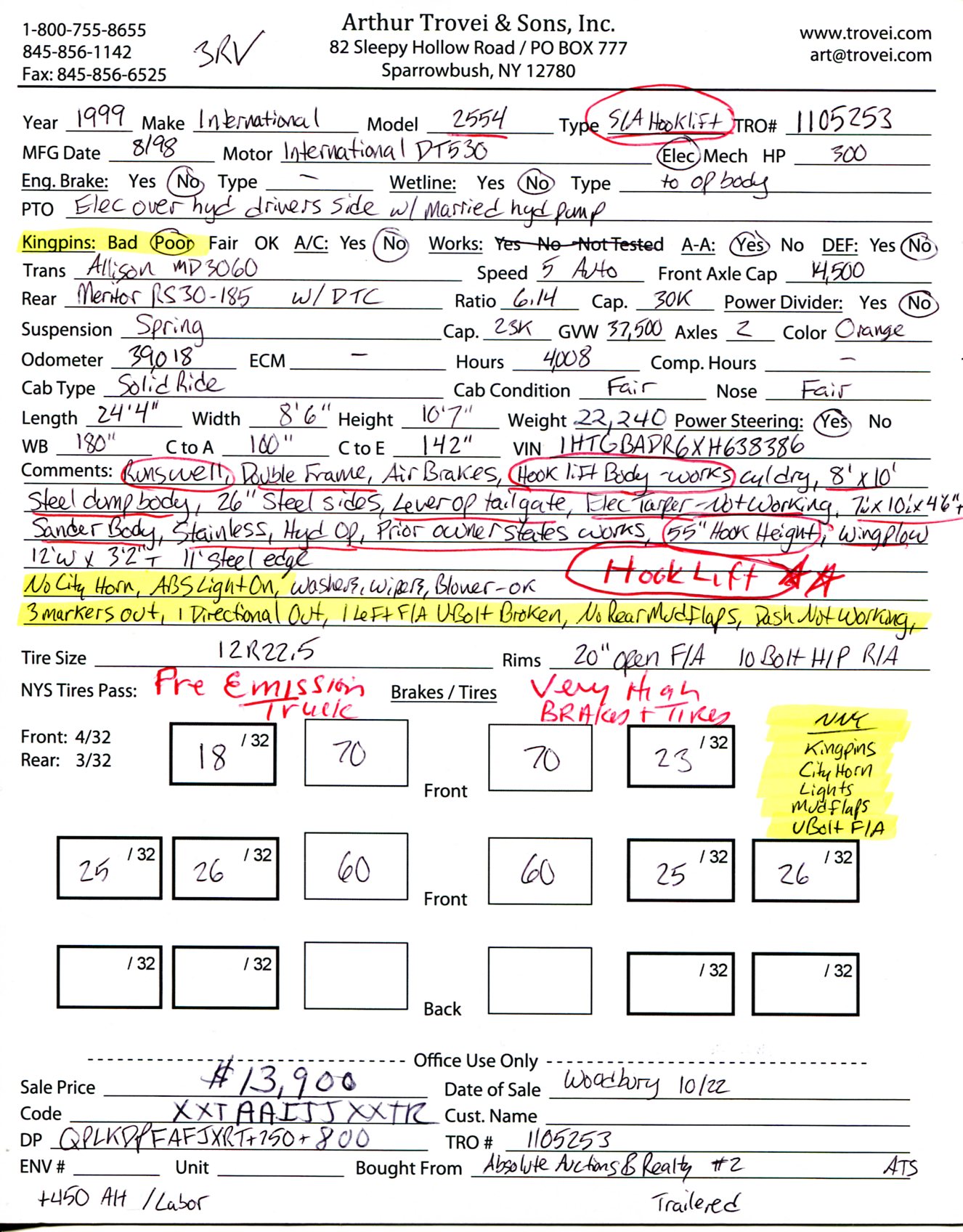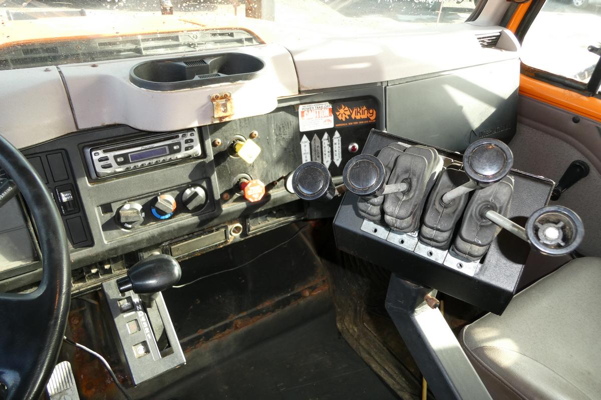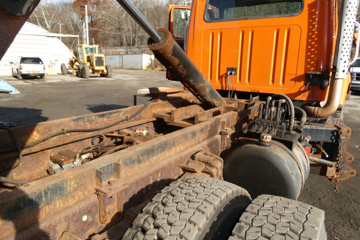 Inventory # 1105253Year: 1999 Make: International Model: 2554 Type: Single Axle Hook Lift Truck Type: 1HTGBADR6XH638386 Motor: International DT530 Elec 300 HP Wetline: Hydraulics For Hook Lift Body / Plow Air to Air: Yes Air Conditioning: No Engine Brake: No Transmission: Allison MD3060 5 Speed Automatic PTO: Electric Over Hydraulic Drivers Side With Married Hydraulic Pump Front Axle: 14,500 lb Rear: Meritor RS30-185 w/ DTC 30,000 lb Ratio: 6.14 Power Divider: No Suspension: Spring 23,000 lb Tires: 12R22.5 Rims: 20" Open F/A 10 Bolt Hub Pilot R/A Odometer Reading: 39,018* ECM Mileage Reading: Hour Meter Reading: 4,008* Computer Hour Reading: Length: 24'4" Width: 8'6" Height: 10'7" (Dump Box On) Wheelbase: 180" Cab to Axle: 100" Cab to End: 142" Weight: 22,240 lb GVW: 37,500 lb Dump Body: 8' W x 10' L Steel Dump Body, 26" Steel Sides, Lever Operated Tailgate, Electric Tarper (Not Working) Sander Body: 7' W x 10' L x 4'6" T Stainless Sander Body, Hydraulic Operated, Prior Owner States Works, 55" Hook Height Added Details: Runs Well, Double Frame, Air Brakes, Front Plow Cylinder, 11' Steel Edge Wing Plow, 1 Multi Stage Cylinder - Works, Dry Price: $13,900 NNY 3RVXXTAAIJJXXTRQPLKDPFAFJXRT+750+800+450 Terms of Sale