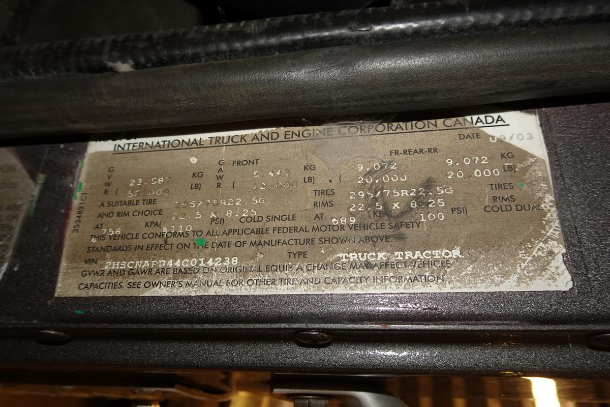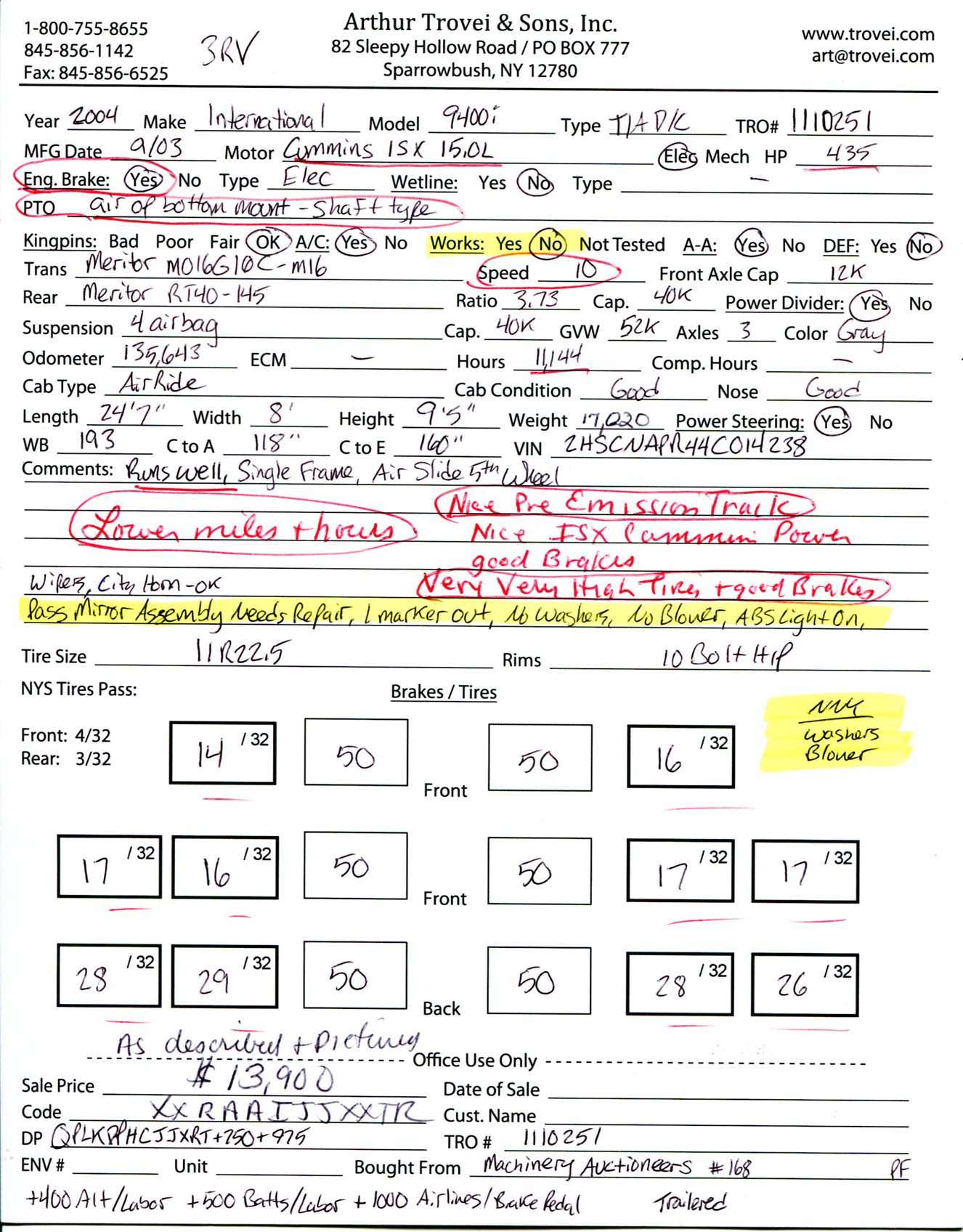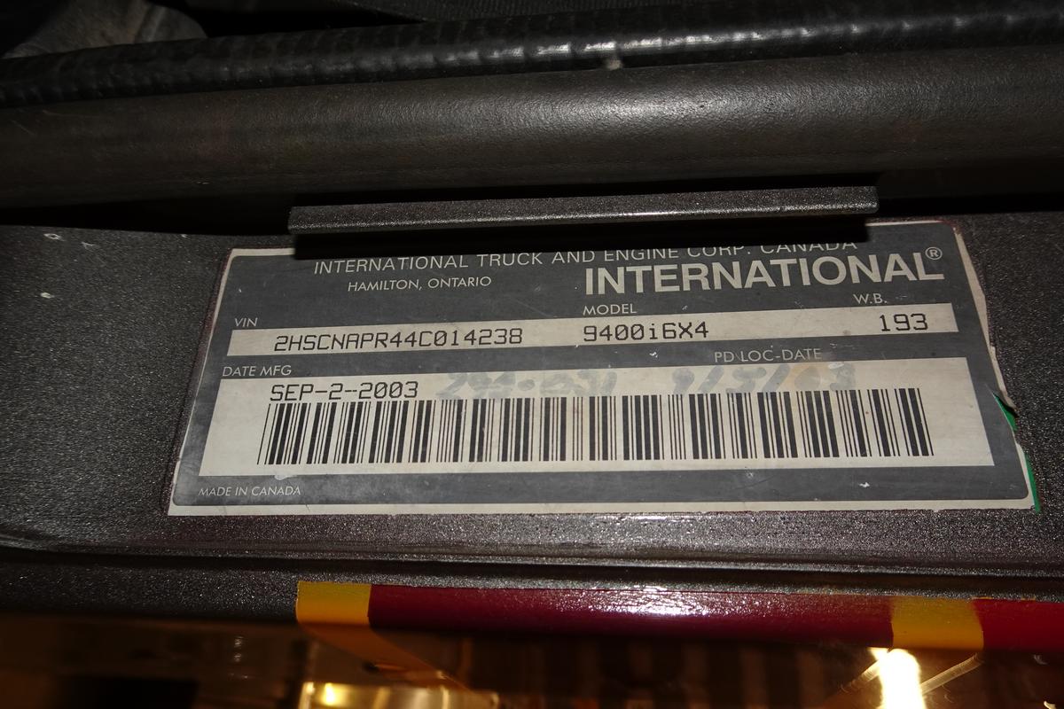 Inventory # 1110251Year: 2004 Make: International Model: 9400i Type: Tandem Axle Day Cab Tractor VIN: 2HSCNAPR44C014238 Motor: Cummins ISX 15.0L Elec 435 HP Air to Air: Yes DEF: No Air Conditioning: Yes (Not Working) Engine Brake: Electronic Transmission: Meritor M016G10C-M16 10 Speed PTO: Air Operated Bottom Mount - Shaft Type Wetline: No Front Axle: 12,000 lb Rear: Meritor RT40-145 40,000 lb Ratio: 3.73 Power Divider: Yes Suspension: 4 Air Bag 40,000 lb Tires: 11R22.5 Rims: 10 Bolt Hub Pilot Odometer Reading: 135,643 ECM: Hour Meter Reading: 11,144 ECM Hour Reading: Length: 24'7" Width: 8' Height: 9'5" Wheelbase: 193" Cab to Axle: 118" Cab to End: 160" Weight: 17,020 lb GVW: 52,000 lb Added Features: Runs Well, Single Frame, Air Slide 5th Wheel Price: $13,900 as described NNY 3RVXXTAAIJJXXTRQPLKDPHCJJXRT+750+975+400+500+1000 Print This Page | Back to Day Cab Tractors Inventory | Ask A Question Terms of Sale