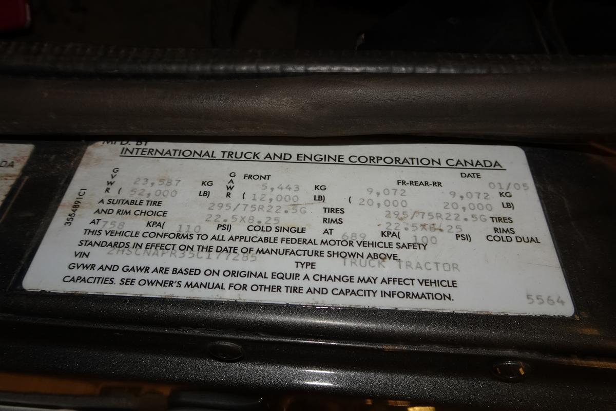 Inventory # 1110252Year: 2005 Make: International Model: 9400i Type: Tandem Axle Day Cab Tractor VIN: 2HSCNAPR35C177285 Motor: Cummins ISX 15.0L Elec 475 HP Air to Air: Yes DEF: No Air Conditioning: Yes (Not Working) Engine Brake: Electronic Transmission: Meritor M016G10C-M16 10 Speed PTO: No Wetline: No Front Axle: 12,000 lb Rear: Meritor RT40-145 40,000 lb Ratio: 3.73 Power Divider: Yes Suspension: 4 Air Bag 40,000 lb Tires: 295/75R22.5 F/A 11R22.5 T/A Rims: 10 Bolt Hub Pilot - Aluminum Fronts Odometer Reading: 307,488 ECM: Hour Meter Reading: 18,822 ECM Hour Reading: Length: 22'7" Width: 8' Height: 9'5" Wheelbase: 169" Cab to Axle: 95" Cab to End: 135" Weight: 16,900 lb GVW: 52,000 lb Added Features: Runs Well, Single Frame, Stationary 5th Wheel Price: $13,900 as described NNY 3RVXXTAAIJJXXTRQPLKDPGGEJXRT+750+975+300 Print This Page | Back to Day Cab Tractors Inventory | Ask A Question Terms of Sale