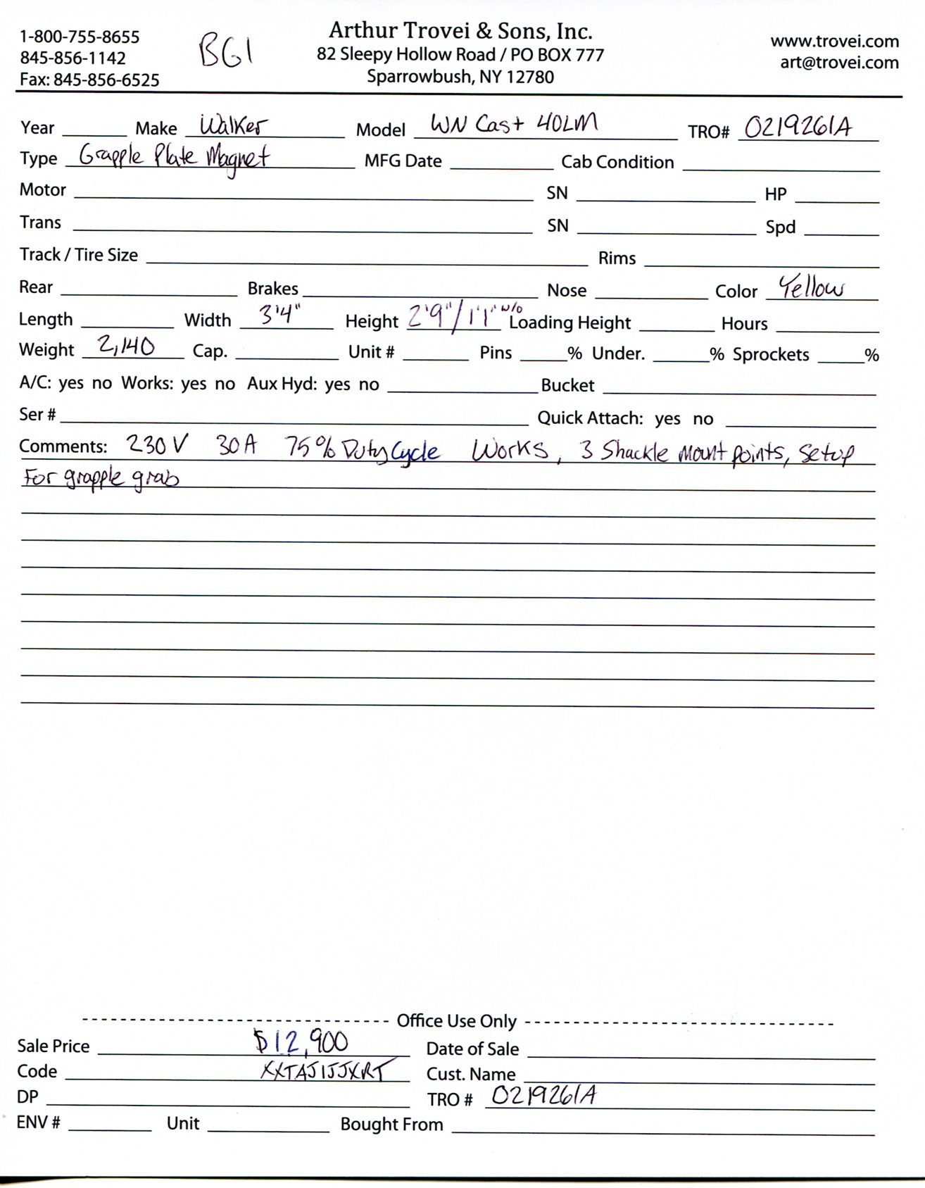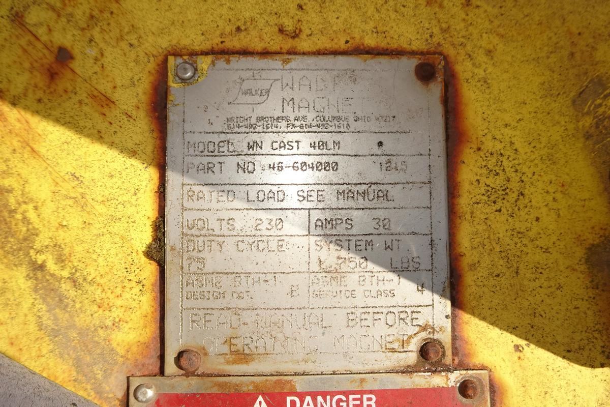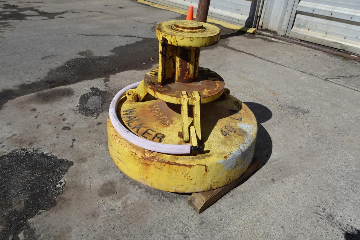 Inventory # 0219261AMake: Walker Model # 40LN Type Plate Magnet Width: 3'4" Height W/ Grapple Grab: 2'9" Height Magnet Only: 1'1" Weight: 2,140 lb Added Details: 230V 30A, 75% Duty Cycle, 3 Shackles, Setup For Grapple Grab, Works Price: $12,900 BG1XXTAJIJJXRT Terms of Sale