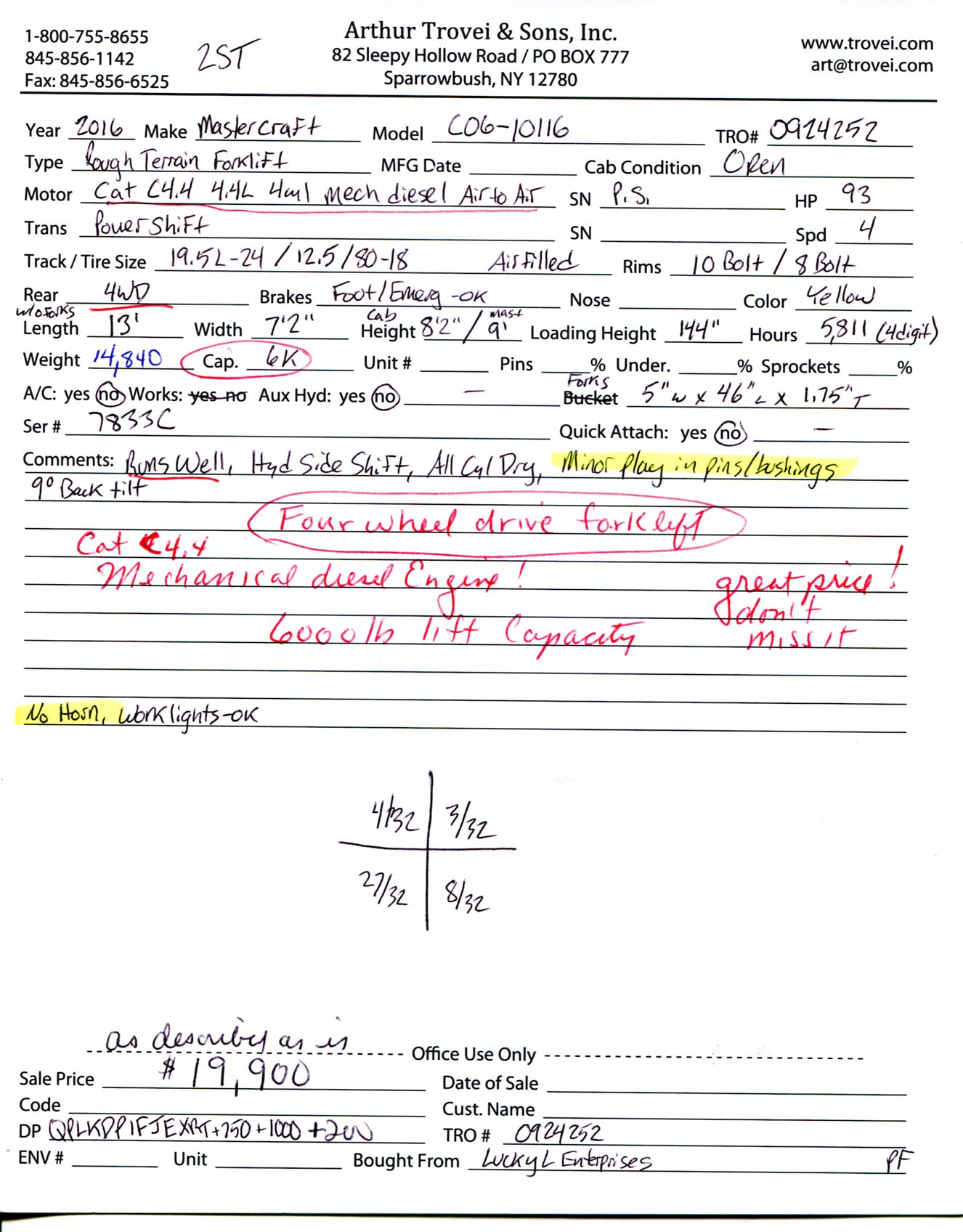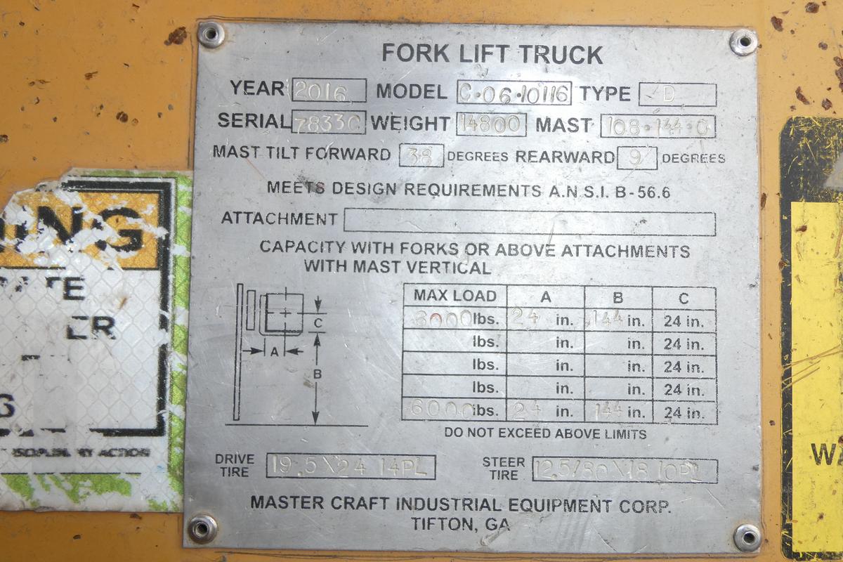 ![]() ![]() ![]() ![]() ![]() ![]() ![]() ![]() ![]() ![]() ![]() ![]() ![]() ![]() ![]() 2016 MasterCraft C06-10116 Diesel Rough Terrain Forklift![]() Year: 2016 Make: MasterCraft Model: C06-10116 Type: Rough Terrain Forklift Serial # 7833C Motor: Caterpillar C4.4 4.4L 4 Cylinder Diesel Mech 93 HP Air To Air: Yes Transmission: Powershift 4 Speed Tires: 19.5L-24 / 12.5/80-18 - Air Filled Rims: 10 Bolt / 8 bolt - Steel Hour Reading: 5,811 (4 digit) Length: 13' (without forks) Width: 7'2" Mast Height: 9' Cab Height: 8'2" Loading Height: 144" Weight: 14,840 Capacity: 6,000 lb Forks: 5" W x 46" L x 1.75" Thick At Base Added Details: Runs Well, 4WD, Power Steering, Minor Play In Pins/Bushings, All Cylinders Dry, Hydraulic Side Shift, Open Cab, Dual Mast, 9 Degrees Backtilt Price: $19,900 as is as described 2STQPLKDPIFJEXRT+750+1000+200 Terms of Sale