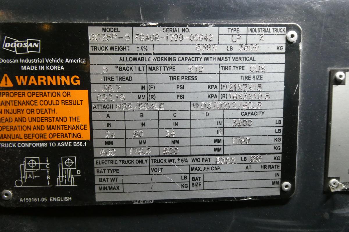 Inventory # 1020235Year: 2014 Make: Doosan Model: GC25P-5 Type: Forklift Serial # FGA0R-1290-00642 Motor: GM 2.4L 4 cylinder elec Propane - propane tank not included Transmission: Automatic - 1 forward 1 reverse Tires: 21x7x15 front - 16x5x10.5 rear solid - 10 Bolt Hour Reading: 21,563 Length w/o forks: 7'5" Width: 3'5" Height: 7'1" Loading Height: 80" Weight: 8,020 lbs Capacity: 3,900 lbs Fork Details: 4" W x 38" L x 1.5" Thick Added Details: Runs and works well - engine light on, one tilt cylinder has minor seepage, double mast, 5 degrees of back tilt, hydraulic side shift Price: $3,900 1YDXXTBIJJXXTRQRTVDPAJJJXRT+750+250 Print This Page | Back to Forklift Inventory | Ask A Question Terms of Sale
