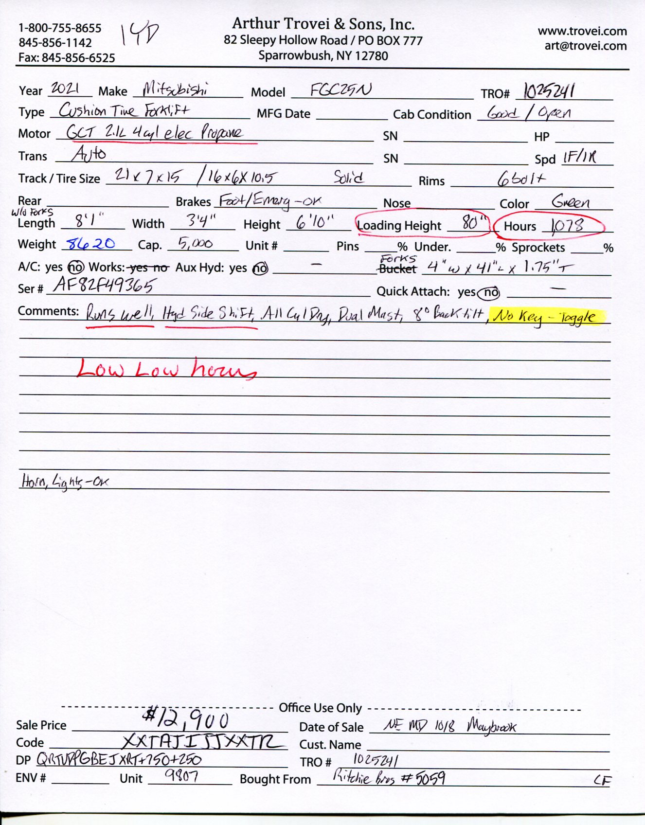 Inventory # 1025241Year: 2021 Make: Mitsubishi Model: FGC25N Type: Forklift Serial # AF82F49365 Motor: GCT 2.1L 4 cylinder elec propane - propane tank not included Transmission: Automatic - 1 forward 1 reverse Tires: 21x7x15 front - 16x6x10.5 rear solid Hour Reading: 1,078 Length w/o forks: 8'1" Width: 3'4" Height: 6'10" Loading Height: 80" Weight: 8,620 lbs Capacity: 5,000 lbs Fork Details: 4" W x 41" L x 1.75" Thick Added Details: Runs and works well, all cylinders dry, dual mast, hydraulic side shift, 8 degrees backtilt Price: $12,900 1YDXXTAJIJJXXRRQRTVDPGBEJXRT+750+250 Print This Page | Back to Forklift Inventory | Ask A Question Terms of Sale