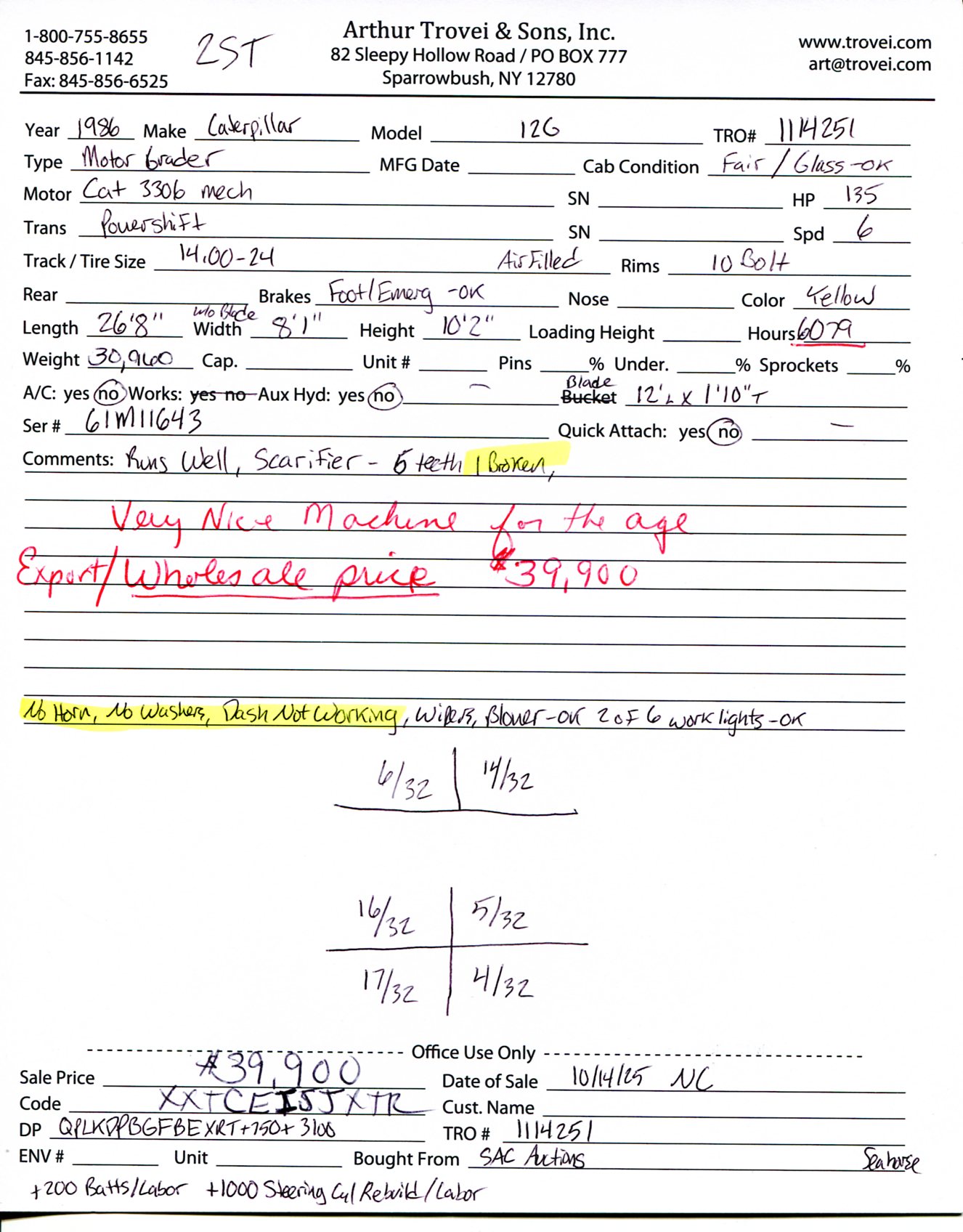 Inventory # 1114251Year: 1986 Serial # 61M11643 Make: Caterpillar Model: 12G Type: Motor Grader Motor: Cat 3306 Mech Inj 135 HP Transmission: Powershift 6 Speed Rear: Tires: 14.00-24 Rims: 10 Bolt - Steel Hours: 6,079 Length: 26'8" Width w/o Blade: 8'1" Height: 10'2" Weight: 30,960 lb Added Details: Runs Well, All Hydraulics Work Well - Minor Seepage, Hydraulic Scarifier With 11 Mounts For Teeth (6 Teeth Installed, 1 Broken), 12' W x 1'10" T Blade Price: $39,900 2STXXTCEIJJXRTQPLKDPBGFBEXRT+750+3100+200+1000 Print This Page | Back to Motor Grader Inventory | Ask A Question Terms of Sale