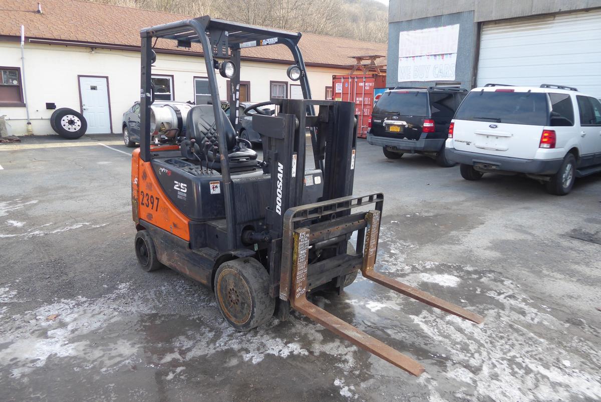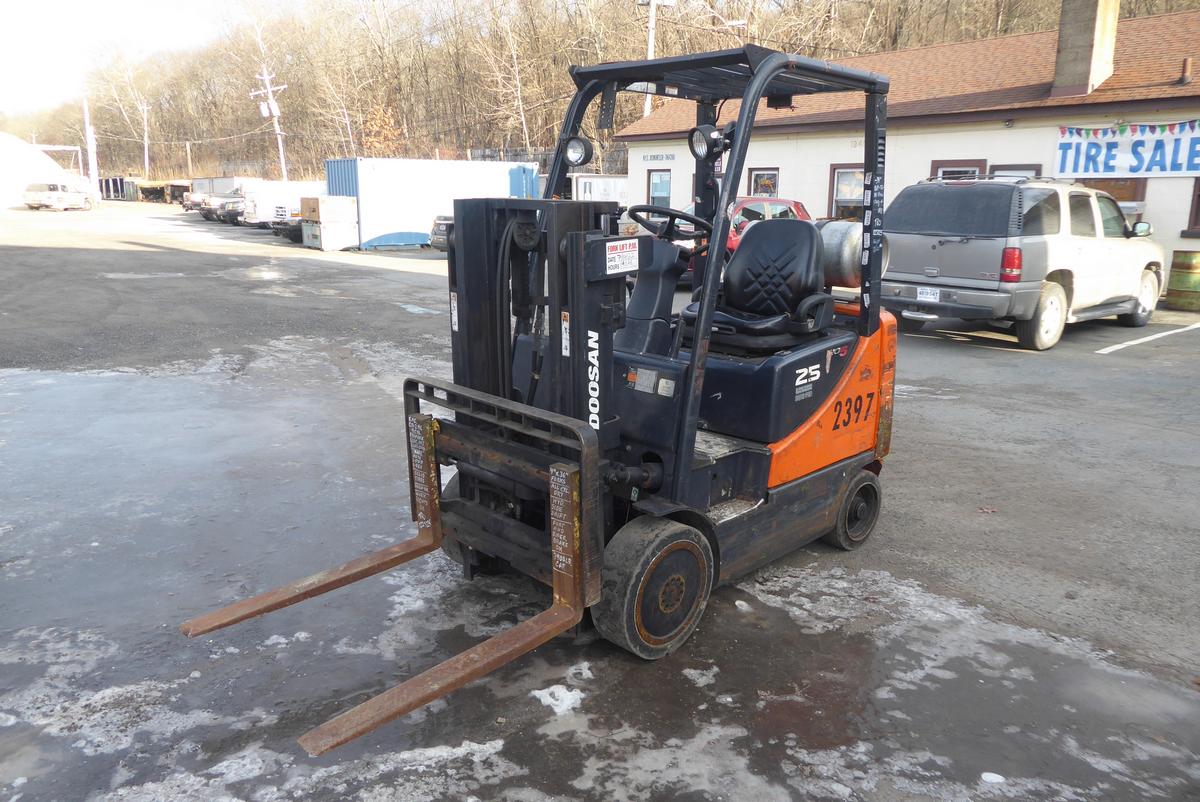 Inventory # 1223225Year: 2014 Serial # FGA0R-1290-00622 Make: Doosan Model: GC25P-5 Type: Forklift Motor: GM G424FE 2.4L 4 cylinder elec Propane 62 hp - propane tank not included Transmission: Automatic - 1 forward 1 reverse Tires: 21x7x15 front - 16x5x10.5 rear solid - 10 Bolt Hour Reading: 19,052 Length w/o forks: 6'10" Width: 3'6" Height: 7'1" Loading Height: 80" Weight: 8,020 lbs Capacity: 3,900 lbs Fork Details: 4" W x 36" L x 1.25" Thick Added Details: Runs and works well, all cylinders dry, double mast, 5 degrees of back tilt, hydraulic side shift Price: $6,900 1YDXXTEIJJXXTRQRTVDPABEJXRT+750+188 Print This Page | Back to Forklift Inventory | Ask A Question Terms of Sale