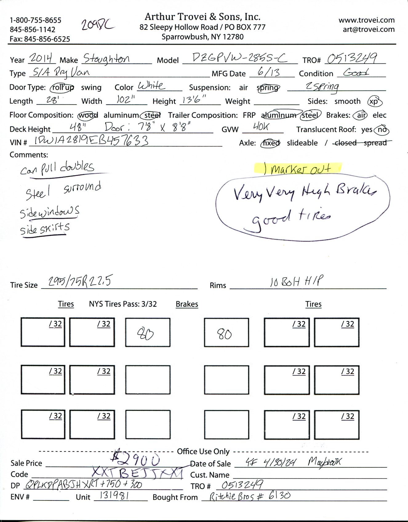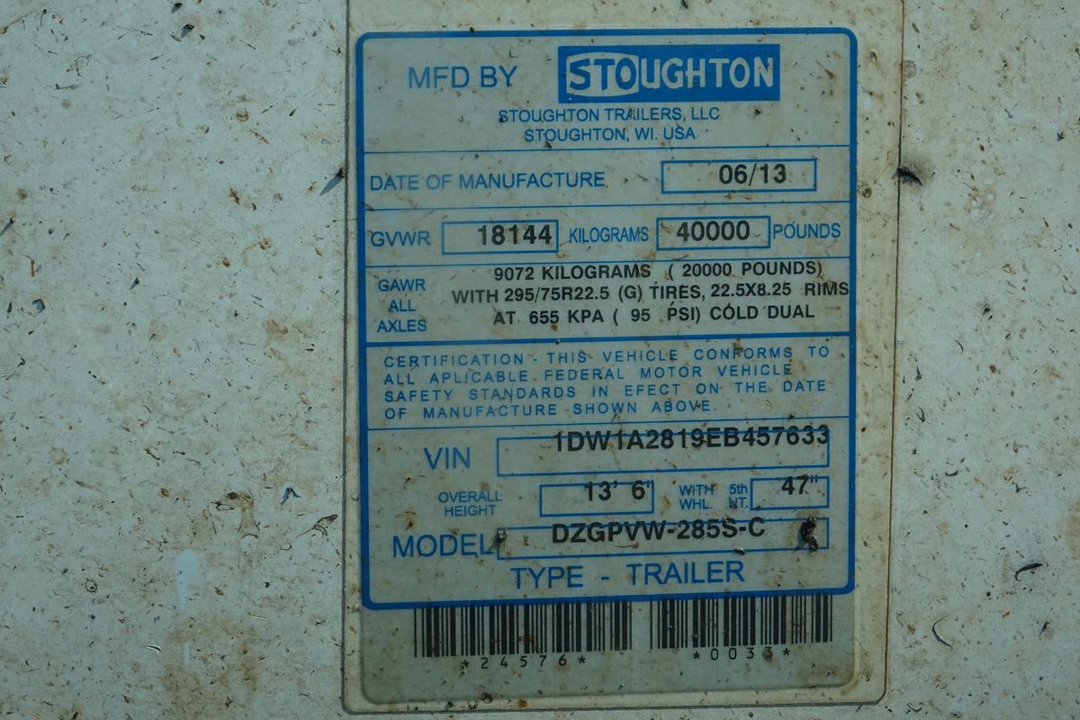 Inventory # 0513249Year: 2014 Make: Stoughton Model: DZGPVW-285S-C Axles: Fixed Single Type: Dry Box Trailer VIN: 1DW1A2819EB457633 Suspension: 2 Spring Tires: 295/75R22.5 Rims: 10 Bolt Hub Pilot - Steel Length: 28' Width: 102" Height: 13'6" Weight (Approximate): 8,540 lb GVW: 40,000 lb Floor Composition: Wood / Steel Trailer Composition: Steel / Aluminum Door Type: Roll Up - Steel Surround Door Opening Width: 7'8" Door Opening Height: 8'8" Added Details: Air Brakes, Can Pull Doubles, Aluminum Roof, Side Windows, Side Skirts Price: $2,900 209DCXXTBEJJXXTQPLKDPABJHXRT+750+300 Terms of Sale