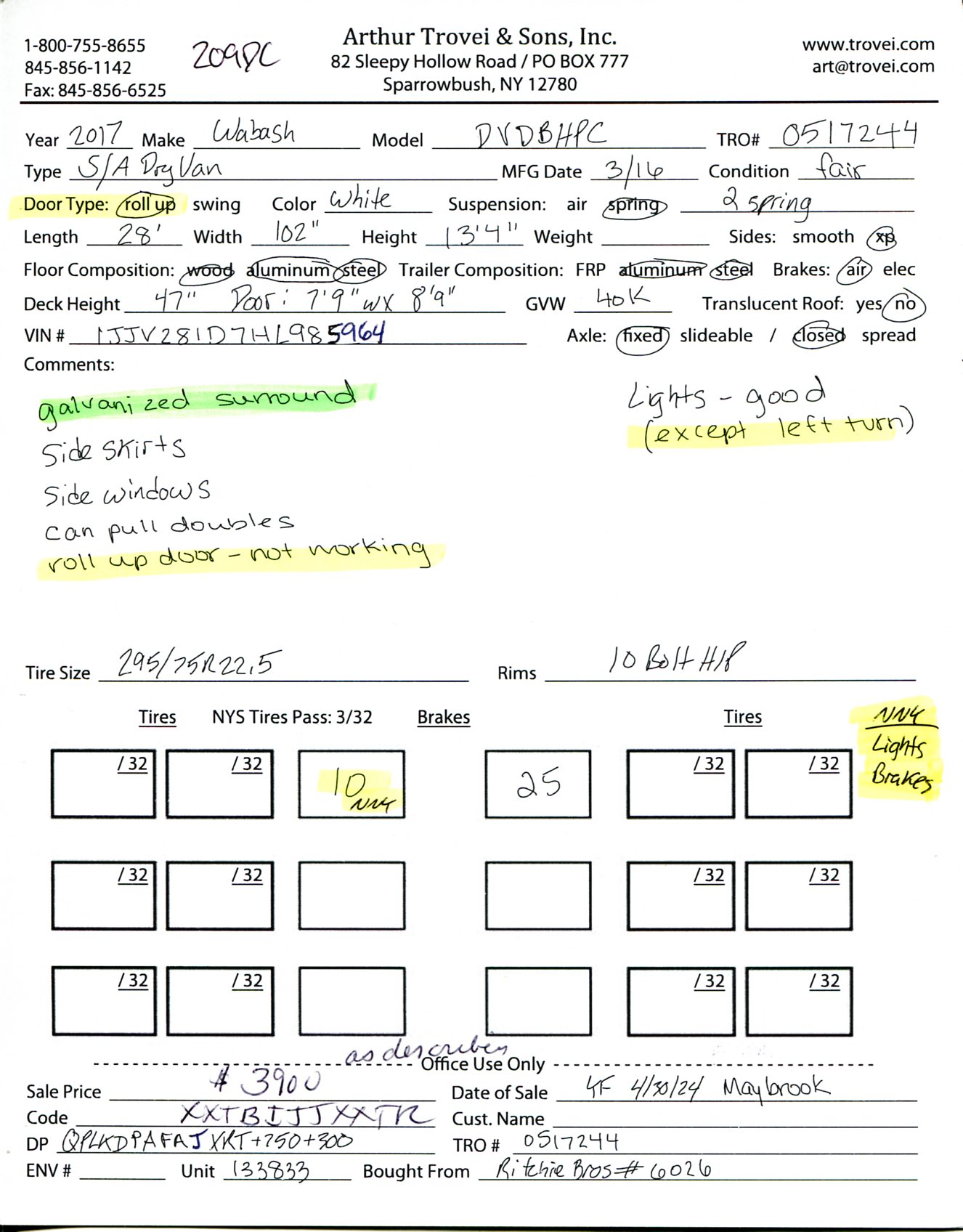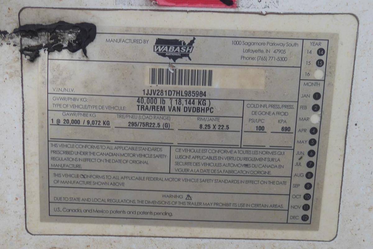 Inventory # 0517244Year: 2017 Make: Wabash Model: DVDBHPC Axles: Fixed single Type: Dry Box Trailer VIN: 1JJV281D7HL985964 Suspension: 2 Spring Tires: 295/75R22.5 Rims: 10 Bolt Hub Pilot - Steel Length: 28' Width: 102" Height: 13'4" Weight (Estimated): 8,760 lb GVW: 40,000 lb Floor Composition: Wood / Steel / Aluminum Trailer Composition: Steel / Aluminum Door Type: Roll Up - Galvanized Surround (Not Working) Door Opening Width: 7'9" Door Opening Height: 8'9" Added Details: Air Brakes, Side Windows, Can Pull Doubles, Aluminum Roof, Side Skirts, Vertical Logistics Price: $3,900 as described NNY 209DCXXTBIJJXXTQPLKDPAFAJXRT+750+300 Terms of Sale