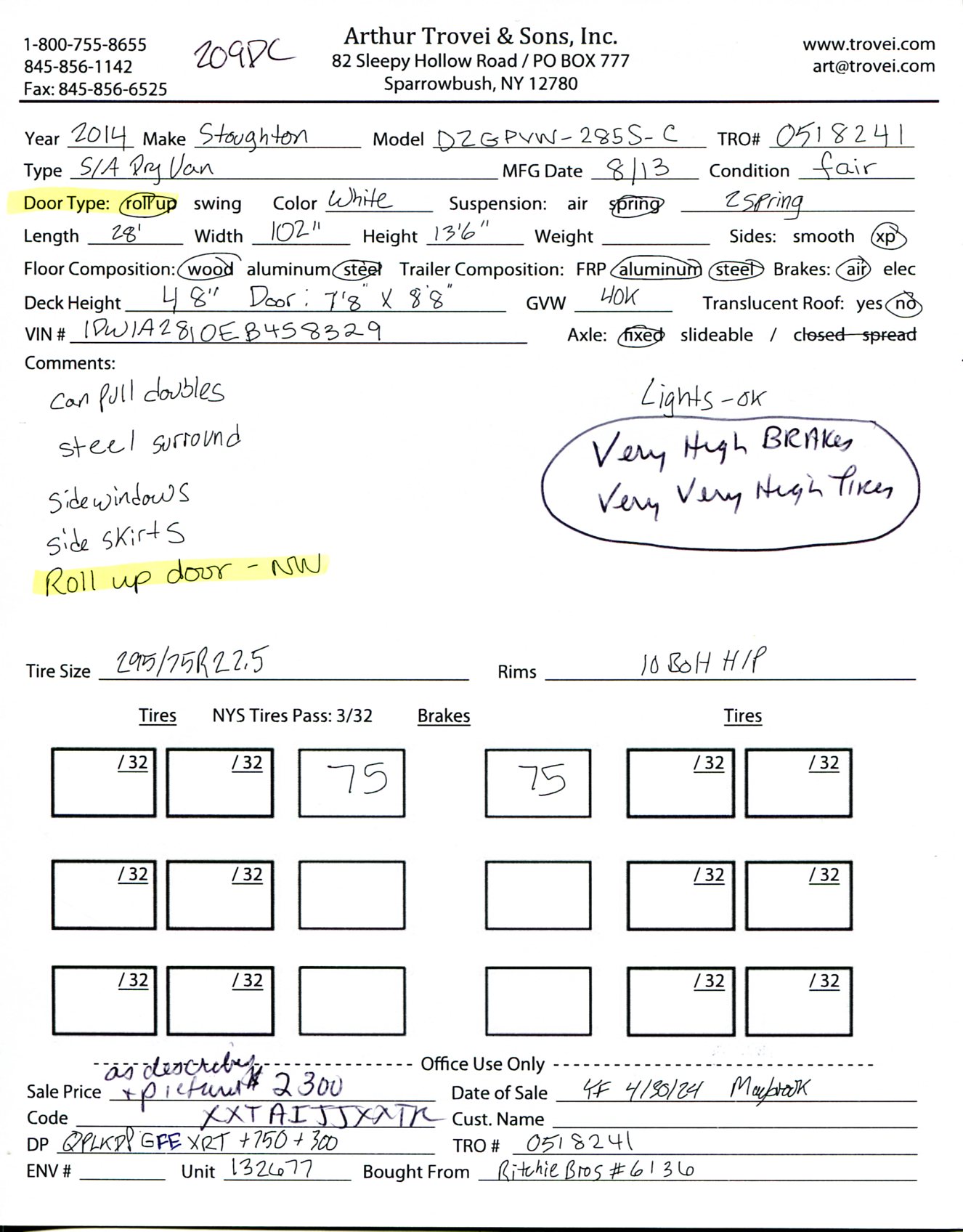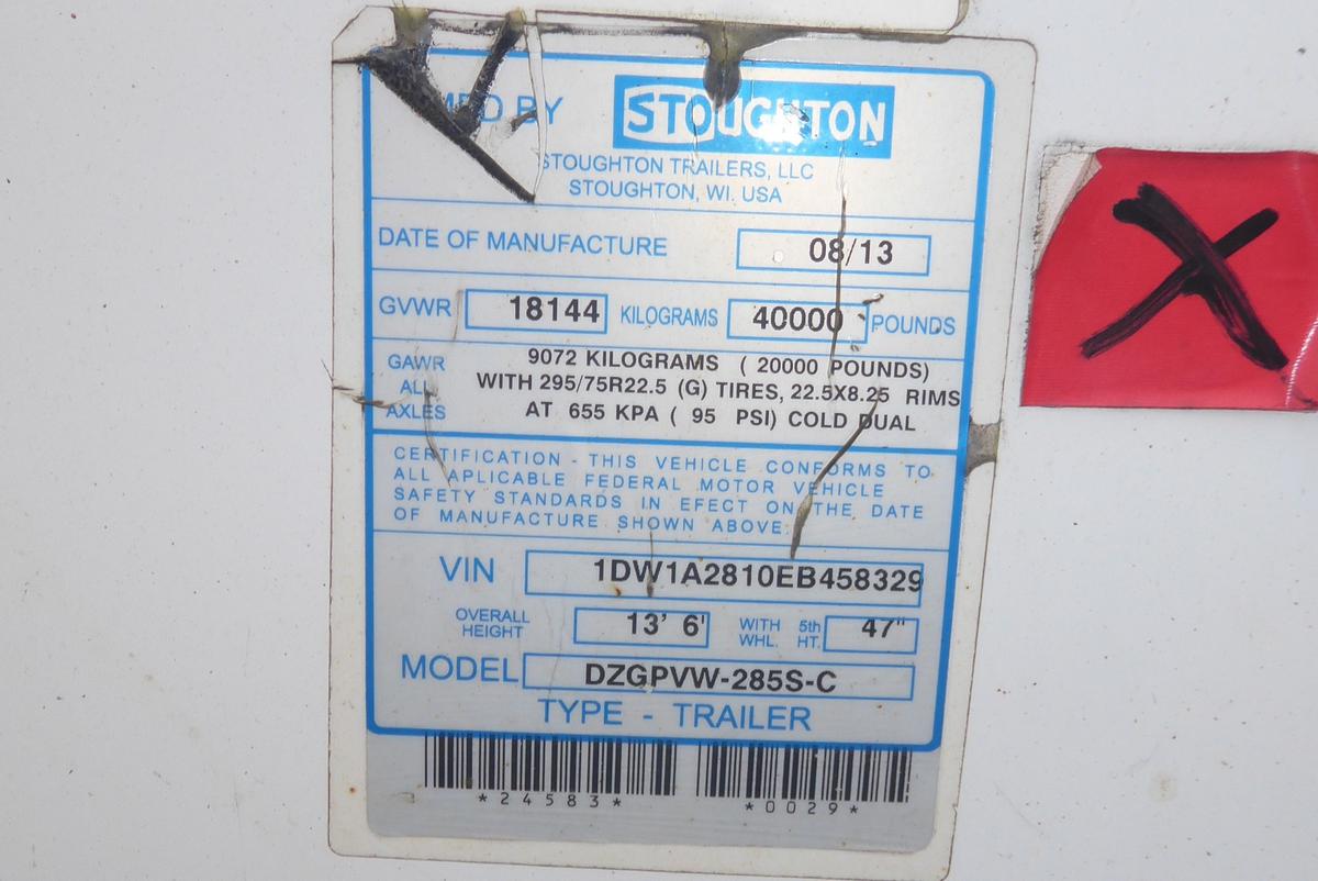 Inventory # 0518241Year: 2014 Make: Stoughton Model: DZGPVW-285S-C Axles: Fixed Single Type: Dry Box Trailer VIN: 1DW1A2810EB458329 Suspension: 2 Spring Tires: 295/75R22.5 Rims: 10 Bolt Hub Pilot - Steel Length: 28' Width: 102" Height: 13'6" Weight (Approximate): 8,540 lb GVW: 40,000 lb Floor Composition: Wood / Steel Trailer Composition: Steel / Aluminum Door Type: Roll Up - Steel Surround (Not Working) Door Opening Width: 7'8" Door Opening Height: 8'8" Added Details: Air Brakes, Can Pull Doubles, Aluminum Roof, Side Windows, Side Skirts Price: $2,300 as described 209DCXXTAIJJXXTQPLKDPGFEXRT+750+300 Terms of Sale