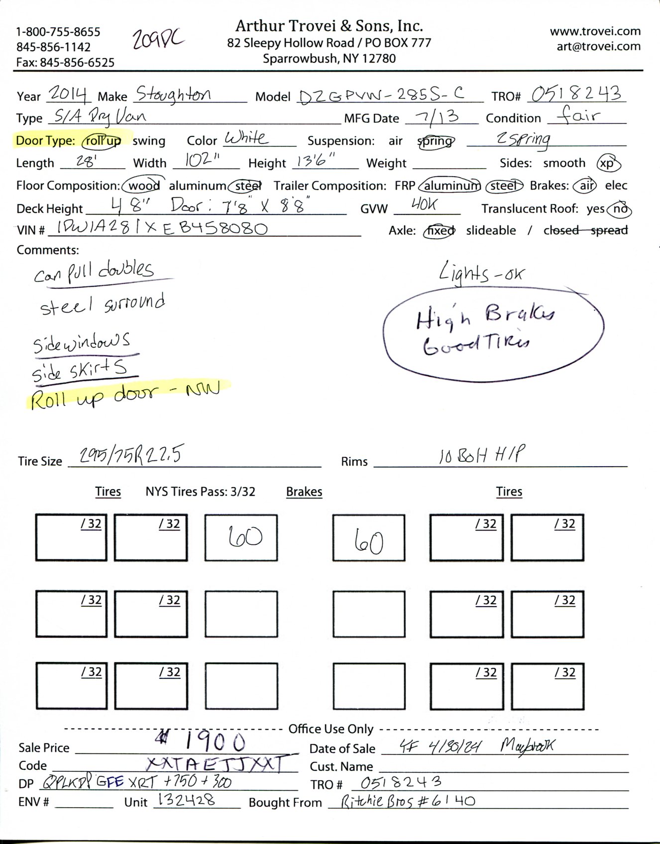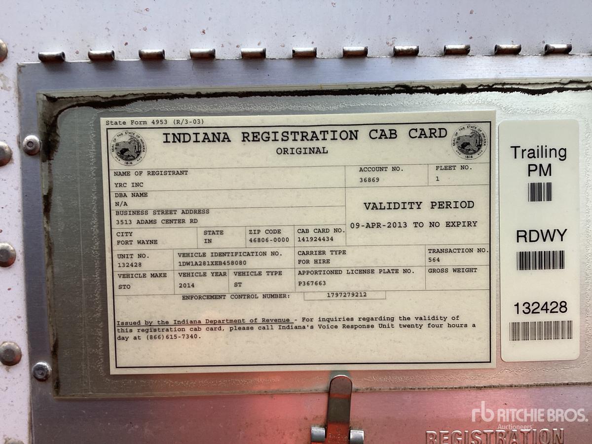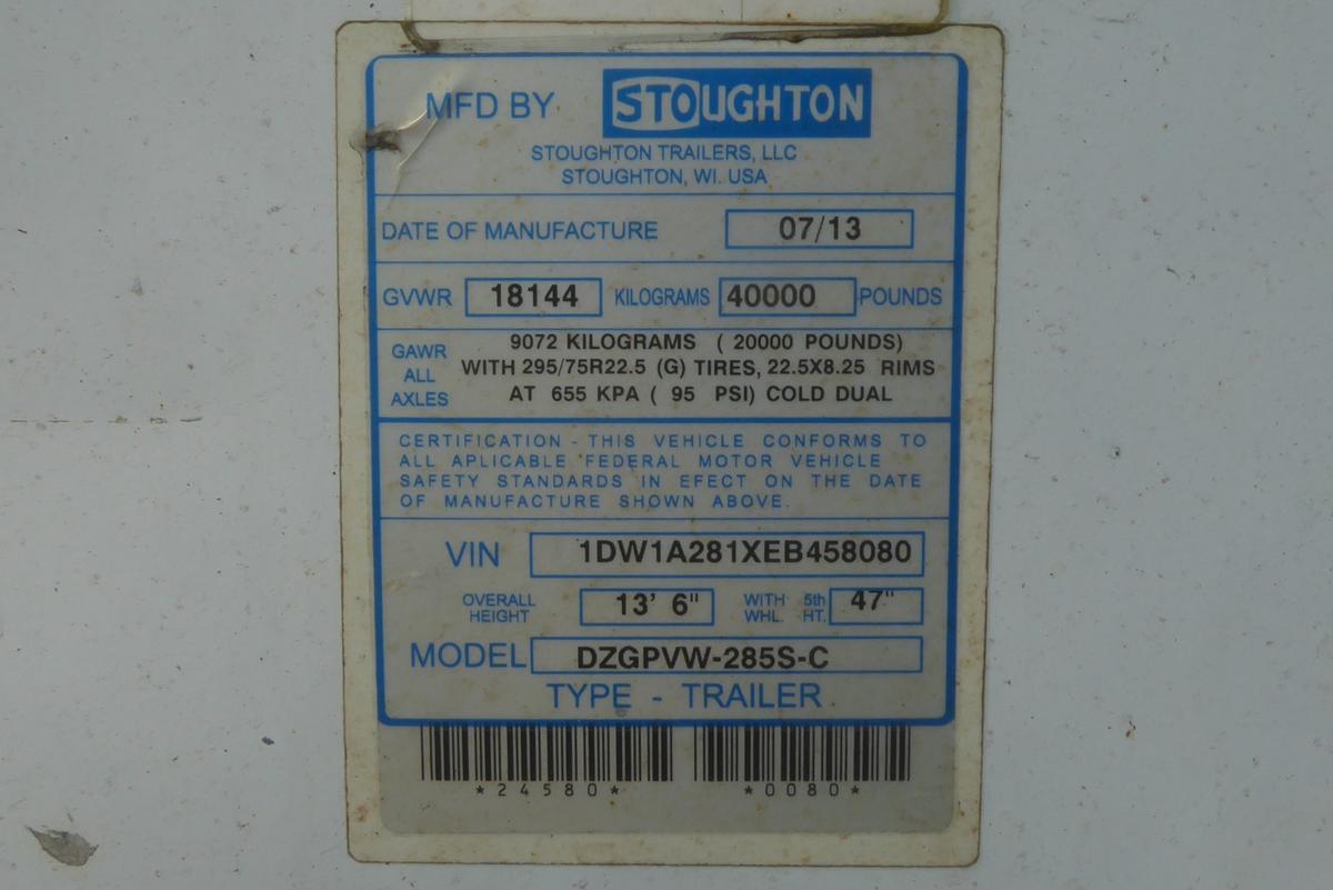 Inventory # 0518243Year: 2014 Make: Stoughton Model: DZGPVW-285S-C Axles: Fixed Single Type: Dry Box Trailer VIN: 1DW1A281XEB458080 Suspension: 2 Spring Tires: 295/75R22.5 Rims: 10 Bolt Hub Pilot - Steel Length: 28' Width: 102" Height: 13'6" Weight (Approximate): 8,540 lb GVW: 40,000 lb Floor Composition: Wood / Steel Trailer Composition: Steel / Aluminum Door Type: Roll Up - Steel Surround (Not Working) Door Opening Width: 7'8" Door Opening Height: 8'8" Added Details: Air Brakes, Can Pull Doubles, Aluminum Roof, Side Windows, Side Skirts Price: $1,900 209DCXXTAEJJXXTQPLKDPGFEXRT+750+300 Terms of Sale